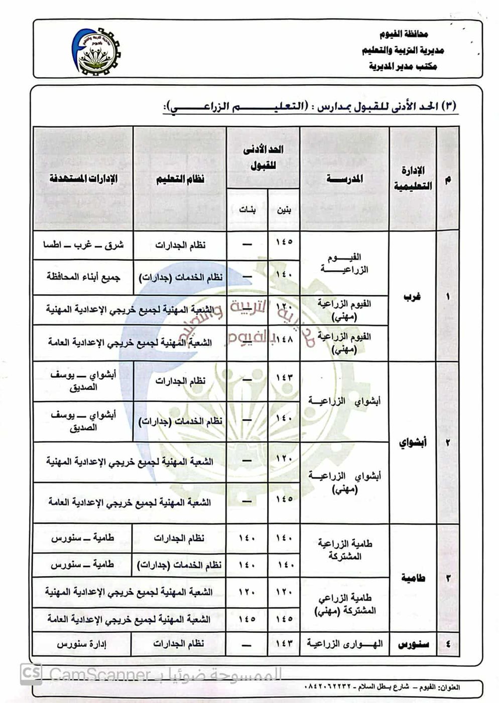 ومدرسة أشواى الزراعية "مهني بنين" بمجموع 120 درجة، للشعبة المهنية لجميع خريجي الإعدادية المهنية، ومجموع 145 درجة لجميع جريجي الإعدادية العامة، ومدرسة طامية الزراعية المشتركة، بمجموع 140 درجة للنظامين "جدارات وخدمات"،ويستهدف بها طلاب إدارتي طامية وسنورس التعليميتين، ومدرسة طامية الزراعية المشتركة "مهني"، بمجموع 120 درجة لجميع طلاب الشعبة المهنية بالإعدادية المهنية، ومجموع 145 درجة للمدرسة نفسها، لجميع طلاب الشعبة المهنية بالإعدادية العامة، ومدرسة الهواري الزراعية بسنورس "بنين" بمجموع 143 درجة لنظام الجدارات.