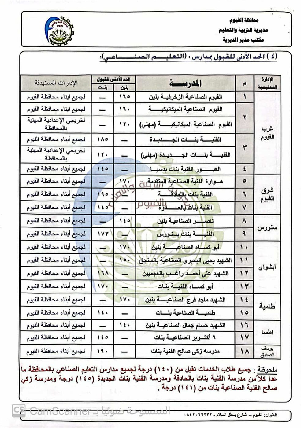 كما تم اعتماد درجات القبول بمدارس التعليم الفني الصناعي كالتالي، مدرسة الفيوم الصناعية الزخرفية بنين 165 درجة، ومدرسة الفيوم الصناعية الميكانيكية 160 درجة، ومدرسة الفيوم الصناعية الميكانيكية "مهني" 120 درجة، لخريجي الإعدادية المهنية، ومدرسة الفنية بنات الجديدة 185 درجة، ومدرسة الفنية بنات الجديدة "مهني" 120 درجة، لخريجي الإعدادية المهنية، ومدرسة العبور الفنية بنات بدسيا 145 درجة، ومدرسة هوارة الفنية الصناعية المتقدمة بنين 170 درجة، ومدرسة الفنية بنات بالحادقة 195 درجة.