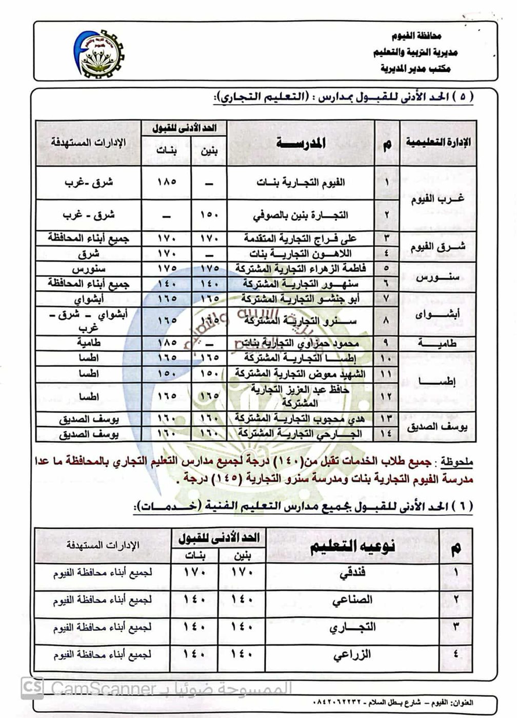ومدرسة أبوجنشو التجارية المشتركة 165 درجة، لخريجي إعدادية إدارة أبشواى، ومدرسة سنرو التجارية المشتركة 165 درجة، لخريجي إدارات شرق وغرب الفيوم وأبشواي، ومدرسة محمود حمزاوي التجارية بنات 185 درجة، لخريجات إدارة طامية التعليمية، ومدرسة إطسا التجارية المشتركة 165 درجة، ومدرسة الشهيد معوض التجارية المشتركة 150 درجة، ومدرسة حافظ عبدالعزيز التجارية المشتركة بإطسا 165 درجة، ومدرسة هدى محجوب التجارية المشتركة بيوسف الصديق 160 درجة، ومدرسة الجارحي التجارية المشتركة 160 درجة.