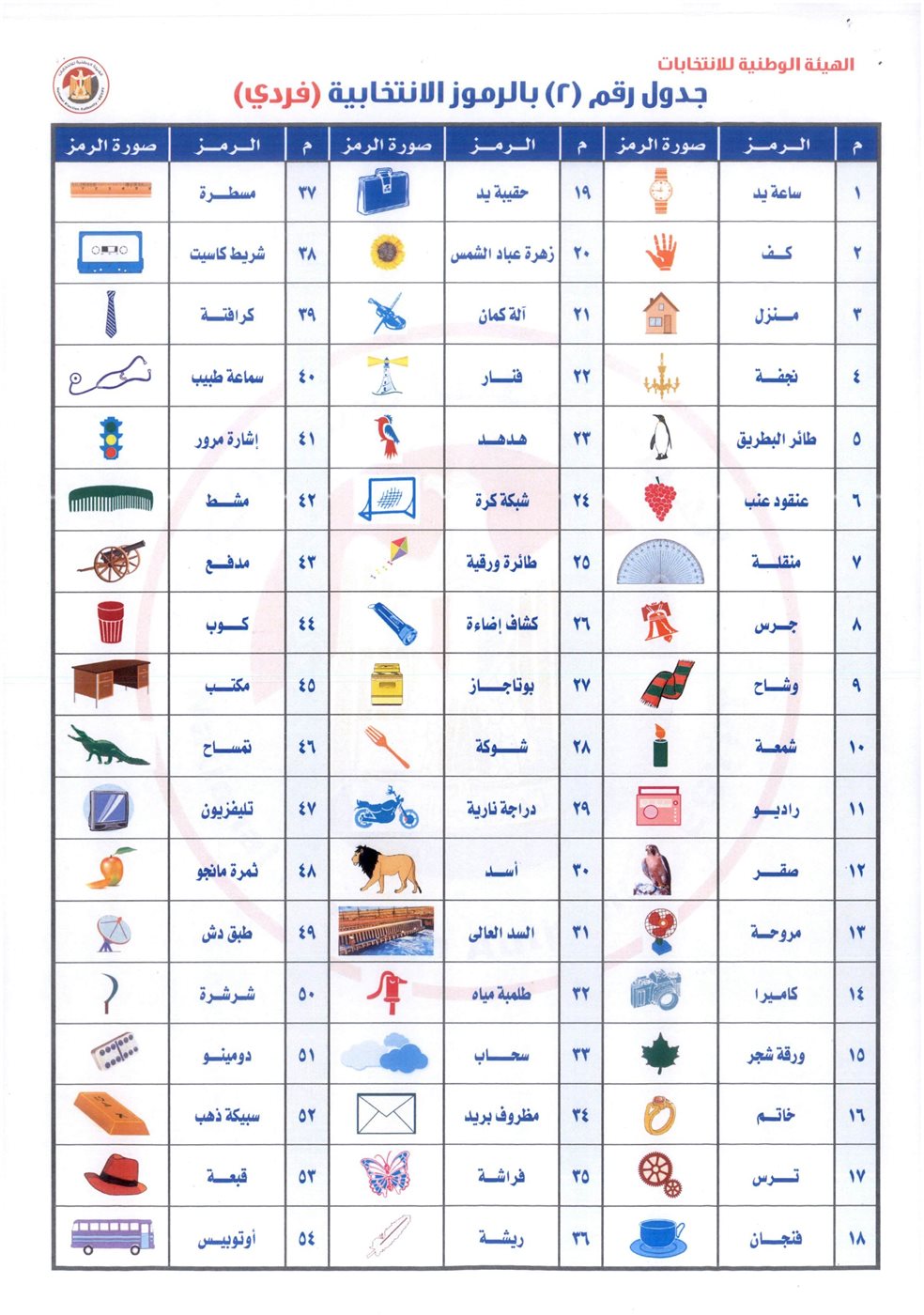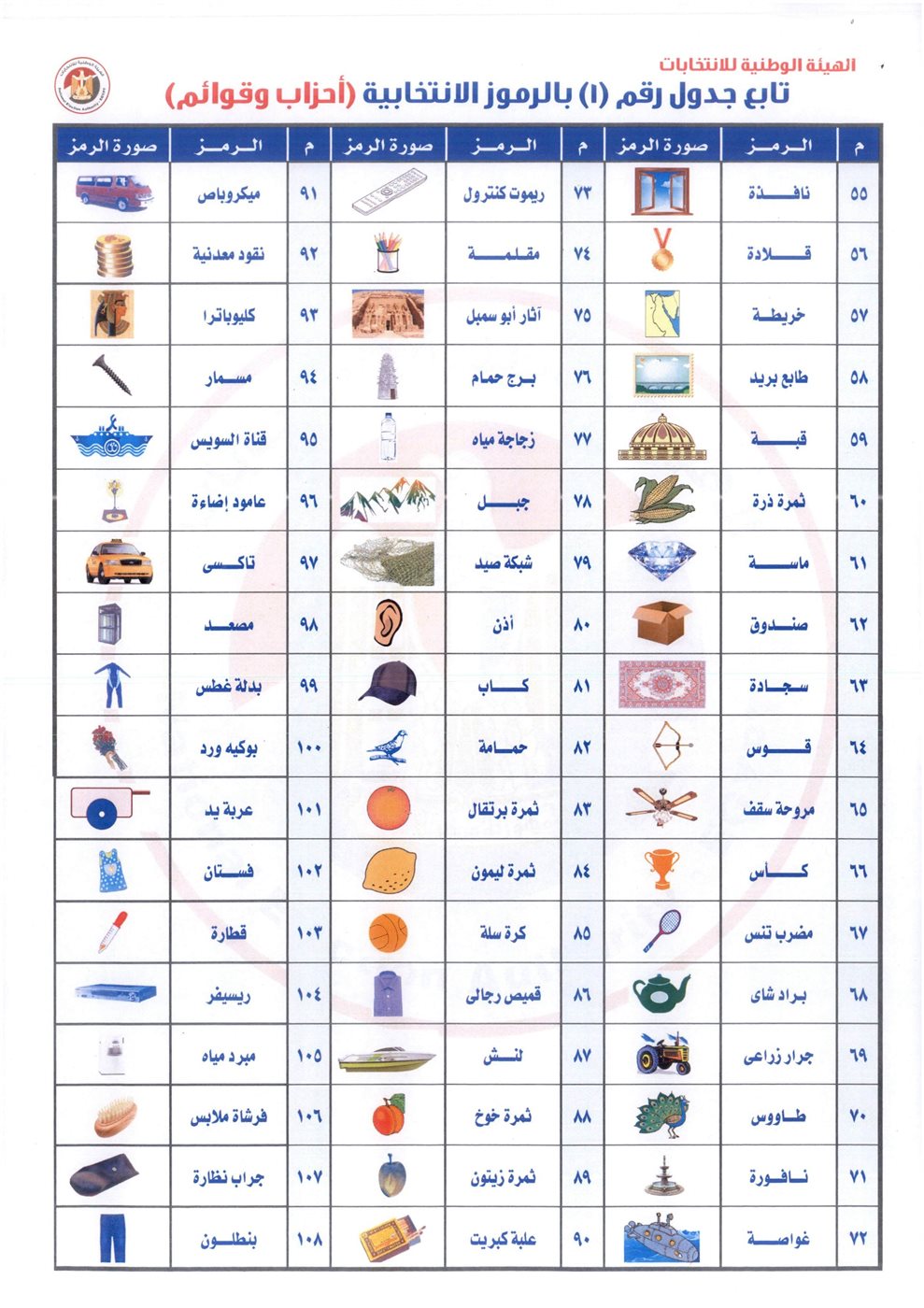 نصت المادة الأولى من القرار على تخصيص الرموز الانتخابية للمترشحين وفق جدولين مرفقين، حيث يتضمن الجدول رقم (1) الرموز الخاصة بمترشحي نظام القوائم والأحزاب، بينما يشتمل الجدول رقم (2) على الرموز المخصصة للمترشحين بنظام الفردي.