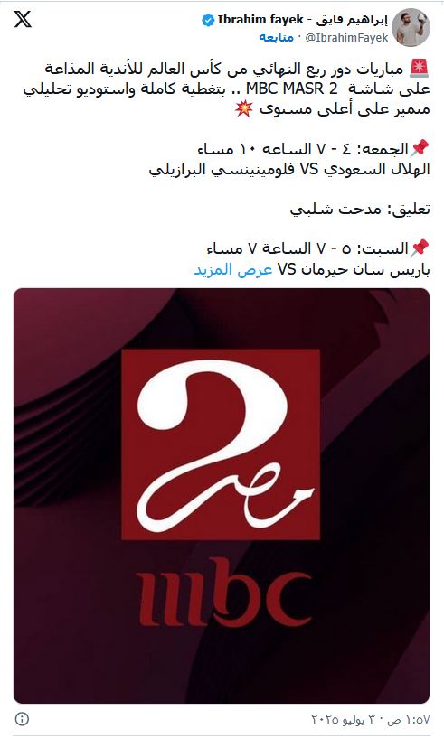وقال"فايق"، إن قناة "MBC MASR 2" ستقوم بإذاعة المباراتين "الهلال ضد فلومينينسي"، و"باريس سان جيرمان ضد بايرن ميونخ".