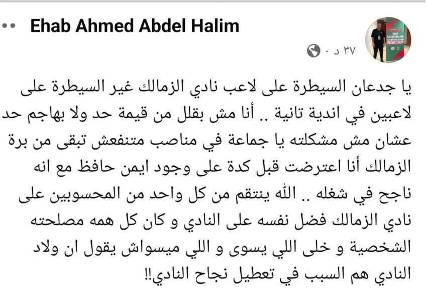 وقال نجل هداف الزمالك الأسبق على "فيسبوك": "السيطرة على لاعب نادي الزمالك غير السيطرة على لاعبين في أندية تانية.. أنا مش بقلل من قيمة حد ولا بهاجم حد عشان مش مشكلته يا جماعة في مناصب متنفعش تبقى من برة الزمالك أنا اعترضت قبل كدة على وجود أيمن حافظ مع أنه ناجح في شغله.. الله ينتقم من كل واحد من المحسوبين على نادي الزمالك فضل نفسه على النادي وكان كل همه مصلحته الشخصية وخلى اللي يسوى واللي ميسواش يقول إن ولاد النادي هم السبب في تعطيل نجاح النادي!!".