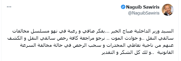 وقال المهندس نجيب ساويرس، في تغريدة عبر منصة "أكس"، في رسالته التي وجهها لـوزير الداخلية: "السيد وزير الداخلية صباح الخير... بفكر صافي ورغبة في نهو مسلسل مخالفات سائقي النقل..وحوادث الموت.. نرجو مراجعة كافة رخص سائقي النقل والكشف عنهم من ناحية تعاطي المخدرات وسحب الرخص في حالة مخالفة السرعة القانونية.. ولك كل الشكر والتقدير".