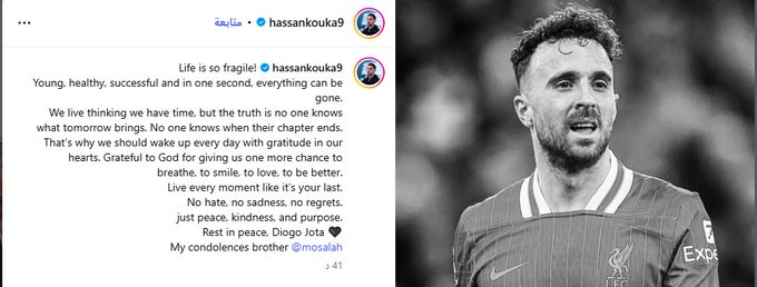 وكتب كوكا عبر حسابه بموقع إنستجرام: "شاب، معافى، ناجح... وفي لحظة واحدة، يمكن أن ينهار كل شيء..نعيش ونحن نظن أن لدينا متسعًا من الوقت، لكن الحقيقة أن لا أحد يعلم ما الذي يخبئه الغد…لا أحد يعلم متى تنتهي فصول قصته…لهذا علينا أن نستيقظ كل يوم بقلب مليء بالامتنان... امتنان لله لأنه منحنا فرصة جديدة للتنفس، للابتسام، للمحبة، ولأن نكون أفضل.. عِش كل لحظة كما لو كانت الأخيرة.. لا كراهية، لا حزن، لا ندم...فقط سلام، ولُطف، وهدف.. ارقد بسلام يا ديوجو جوتا..خالص التعازي لك يا أخي محمد صلاح".