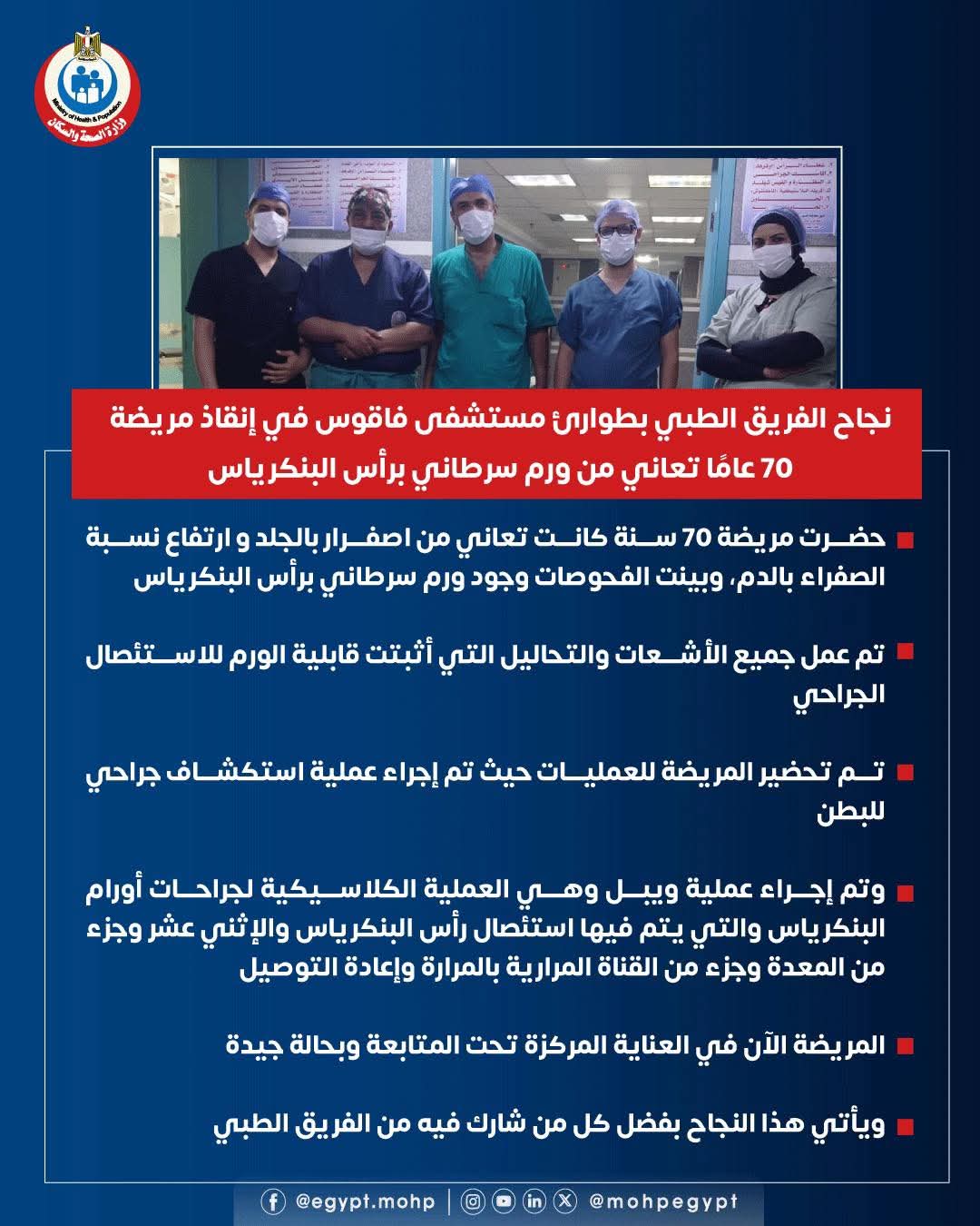 أعلنت وزارة الصحة عن نجاح الفريق الطبي بطوارئ مستشفى فاقوس في إنقاذ مريضة ٧٠ عامًا تعاني من ورم سرطاني برأس البنكرياس.