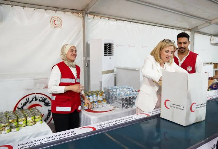 وزيرة خارجية النمسا تزور الهلال الأحمر وتشارك في تجهيز المساعدات الغذائية إلى غزة (صور)