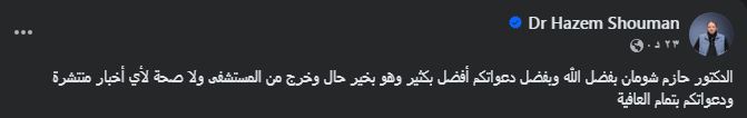 ونفى أحد القائمين على صفحة الداعية على مواقع التواصل الاجتماعي "فيسبوك" الأنباء التي ترددت مؤخرا، وقال: "الدكتور حازم شومان بفضل الله وبفضل دعواتكم أفضل بكثير وهو بخير حال، وخرج من المستشفى، ولا صحة لأي أخبار منتشرة، ودعواتكم بتمام العافية".