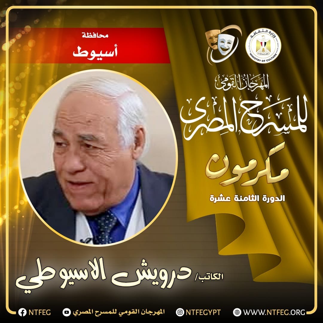 يكرم المهرجان القومي للمسرح المصري برئاسة الفنان محمد رياض في ختام فعالياته بمحافظة أسيوط اليوم الجمعة الكاتب الكبير درويش الأسيوطي كرمز من رموز المسرح في صعيد مصر وبالتحديد في محافظة أسيوط.