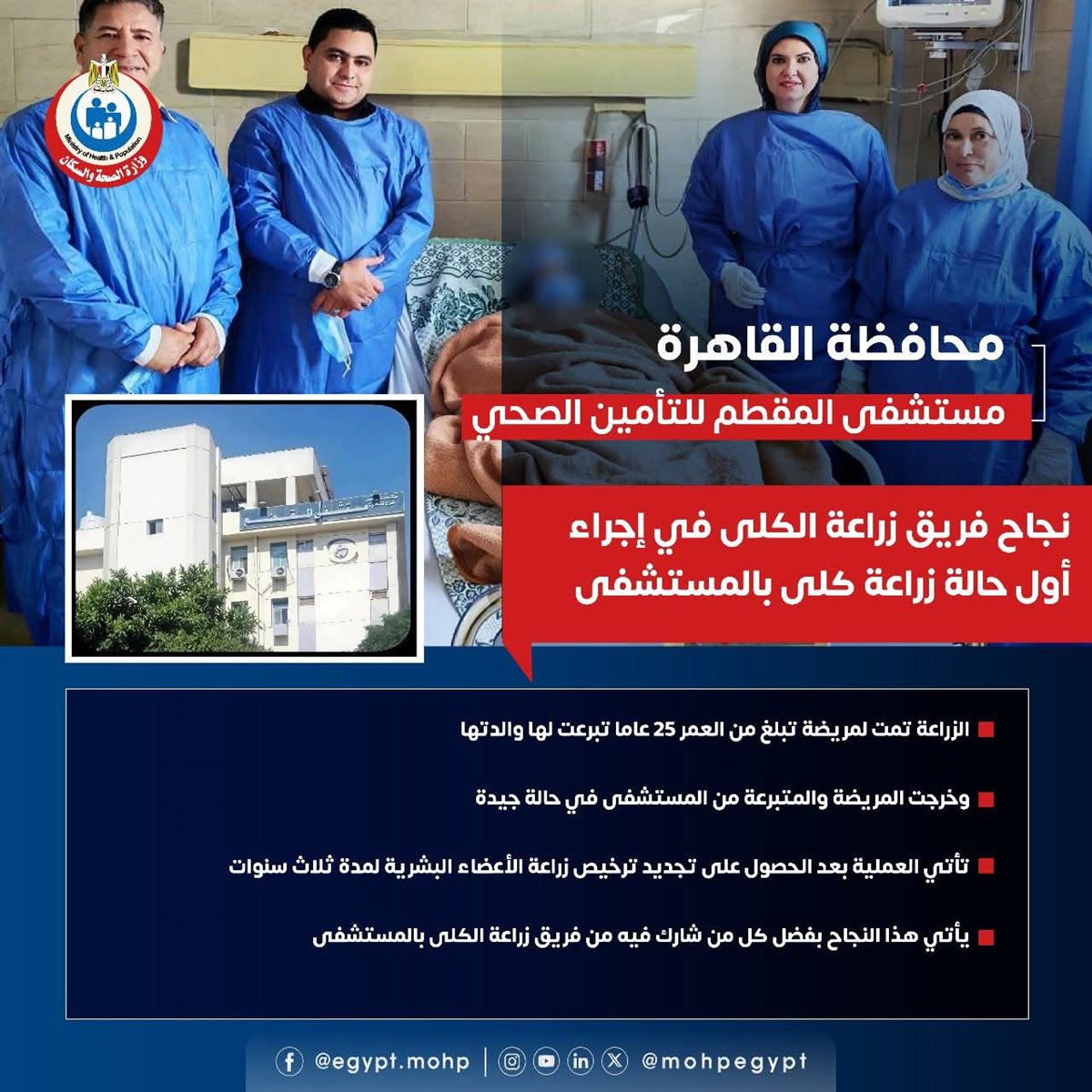 أعلنت وزارة الصحة عن نجاح فريق زراعة الكلى في مستشفى المقطم للتأمين الصحي في إجراء أول عملية زرع كلي تمت لمريضة تبلغ من العمر 25 عاما تبرعت لها والدتها، وخرجت المريضة والمتبرعة من المستشفى في حالة جيدة.