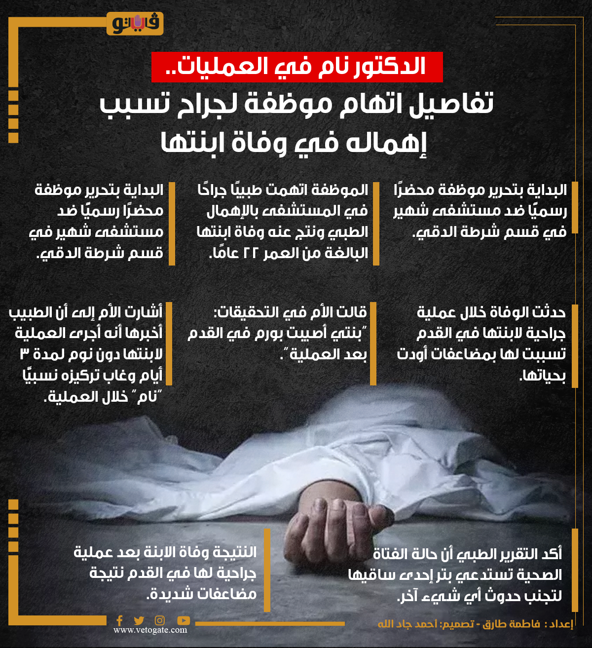 الدكتور نام في العمليات.. تفاصيل اتهام موظفة لجراح تسبب إهماله في وفاة ابنتها (إنفوجراف)
