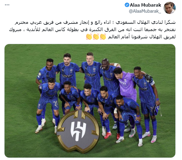 وقال علاء مبارك في رسالته التي وجهها لنادي الهلال بعد توديعه بطولة كأس العالم للأندية: "شكرًا لنادي الهلال السعودي؛ أداء رائع وإنجاز مشرف من فريق عربي محترم نفتخر به جميعًا، أثبت أنه من الفرق الكبيرة في بطولة كأس العالم للأندية، مبروك لفريق الهلال شرفتونا أمام العالم".