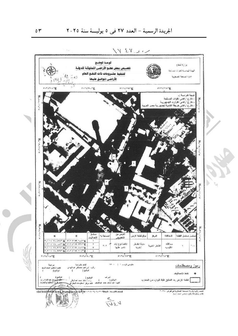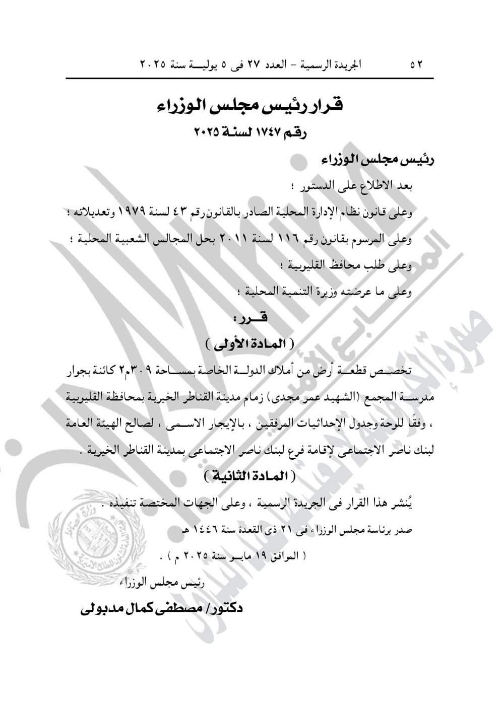 -قرار رئيس الوزراء رقم 1747 لسنة 2025، بشأن تخصيص قطعة أرض من أملاك الدولة الخاصة، بجوار مدرسة المجمع (الشهيد عمر مجدي) زمام مدينة القناطر الخيرية بمحافظة القليوبية، بالإيجار الأسمي، لصالح الهيئة العامة لبنك ناصر الاجتماعي لإقامة فرع لبنك ناصر الاجتماعي بمدينة القناطر الخيرية.
