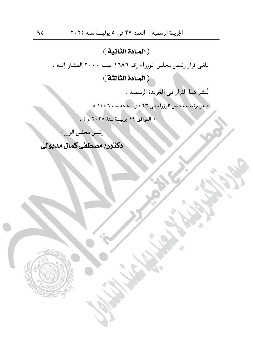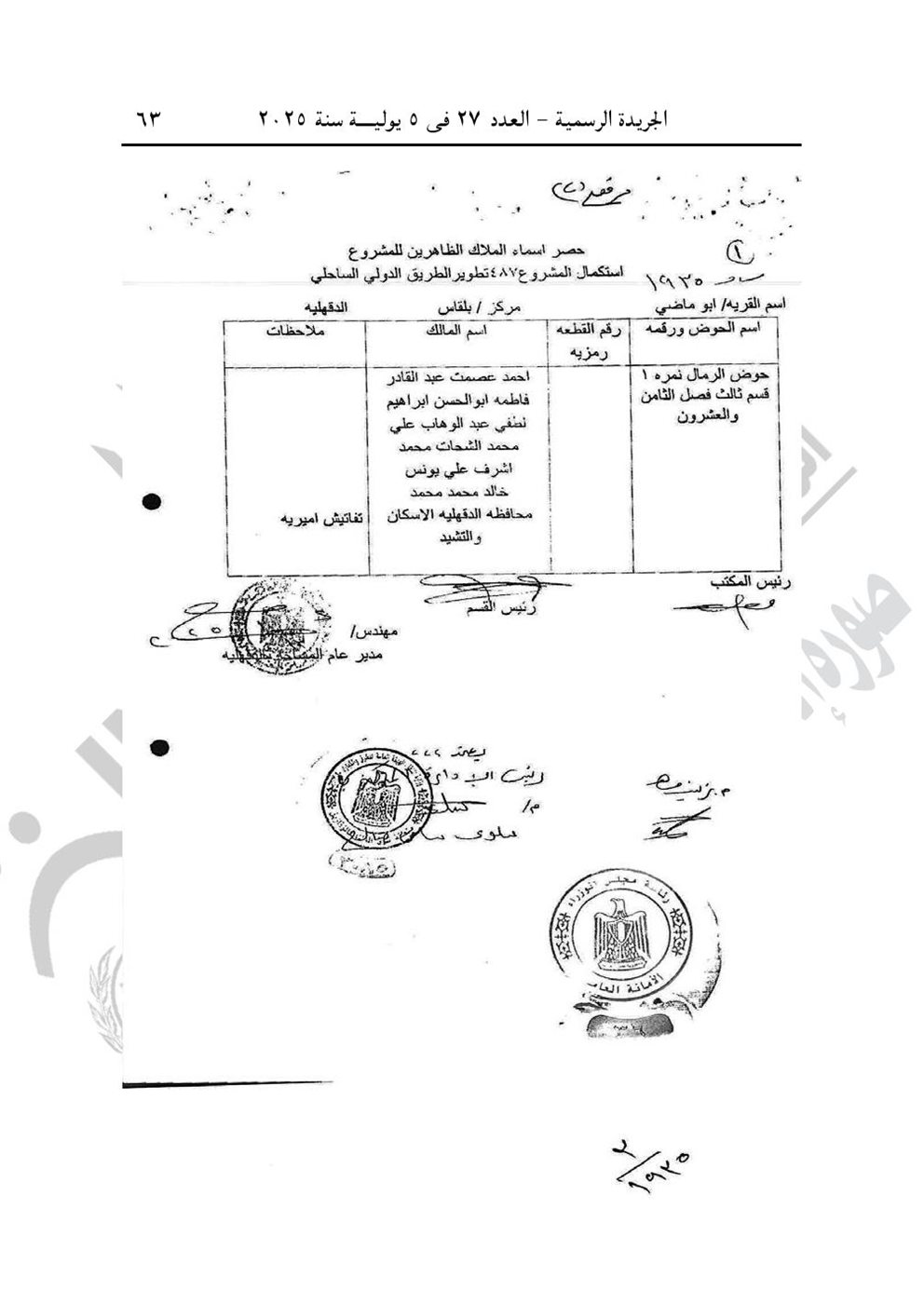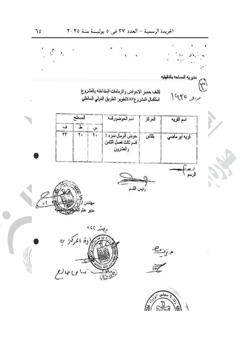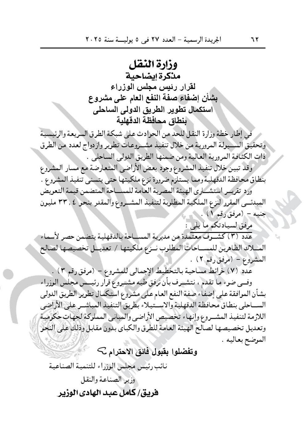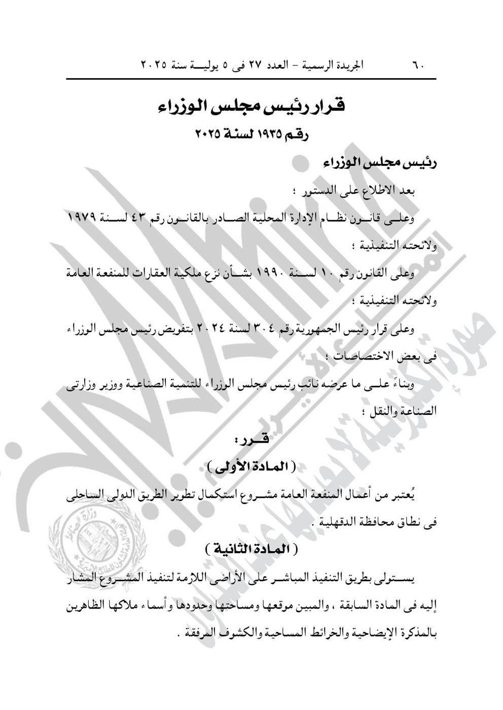 -وقرار رئيس الوزارء رقم 1935 لسنة 2025، باعتبار مشروع استكمال تطوير الطريق الدولي الساحلي في نطاق محافظة الدقهلية، من أعمال المنفعة العامة.