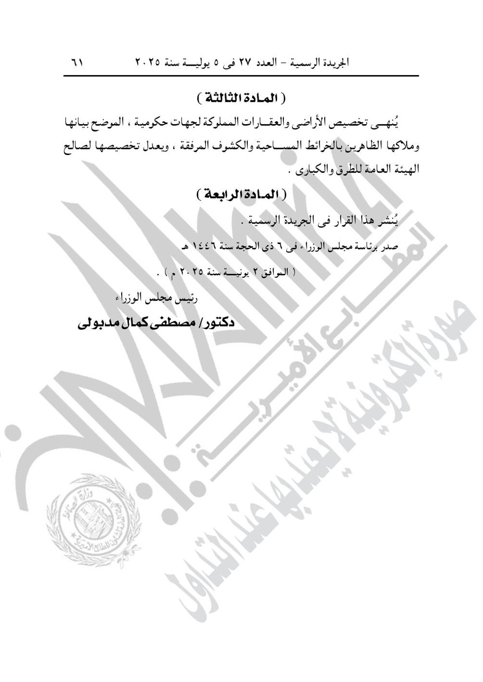 نشرت الجريدة الرسمية في عددها رقم 27، الصادر في 5 يولية 2025، 6 قرارات جديدة لرئيس الوزراء الدكتور مصطفى مدبولي، بشأن تخصيص قطع أرض من أملاك الدولة الخاصة لإقامة مشروعات.