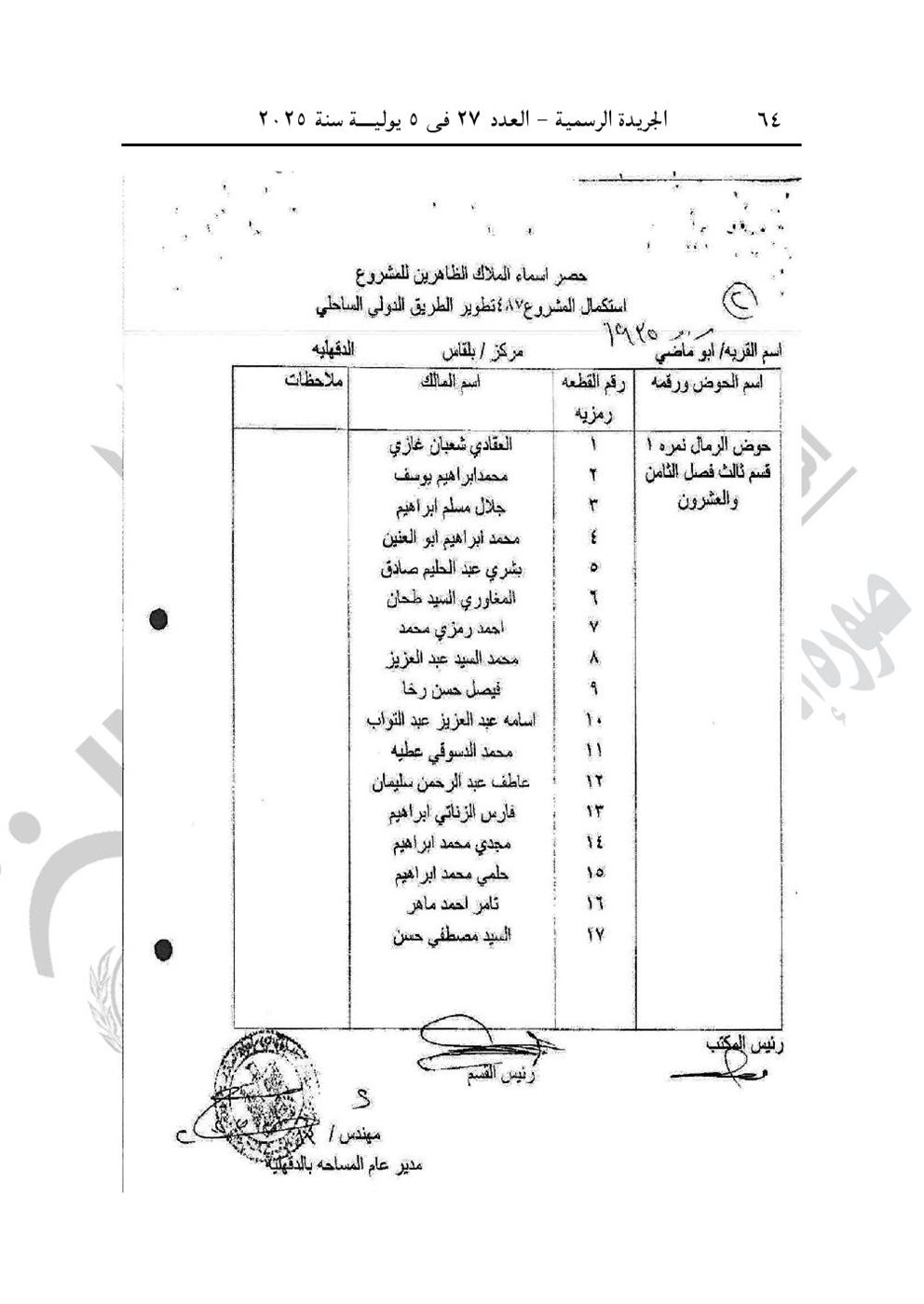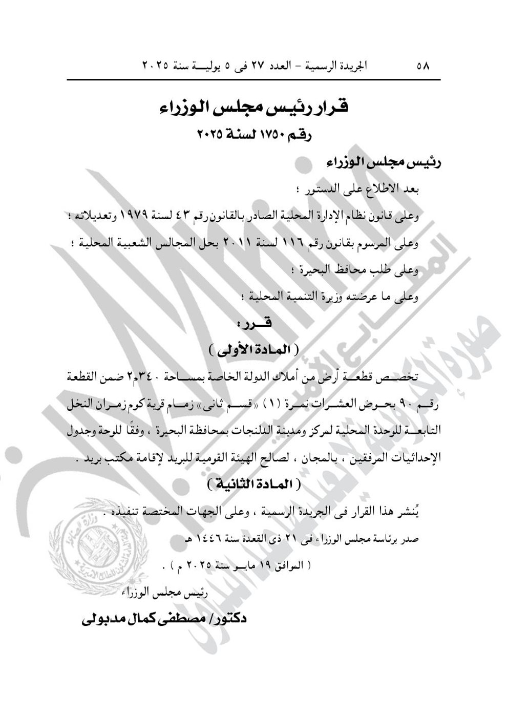 -وقرار رئيس الوزارء رقم 1750 لسنة 2025، بتخصيص قطة أرض من أملاك الدولة الخاصة بحوض العشرات نمرة (1)، قسم ثاني زمام قرية كوم زمران النخل، التابعة للوحدة المحلية لمركز ومدينة الدلنجات بمحافظة البحيرة، بالمجان، لصالح الهيئة القومية للبريد ٌقامة مكتب بريد.