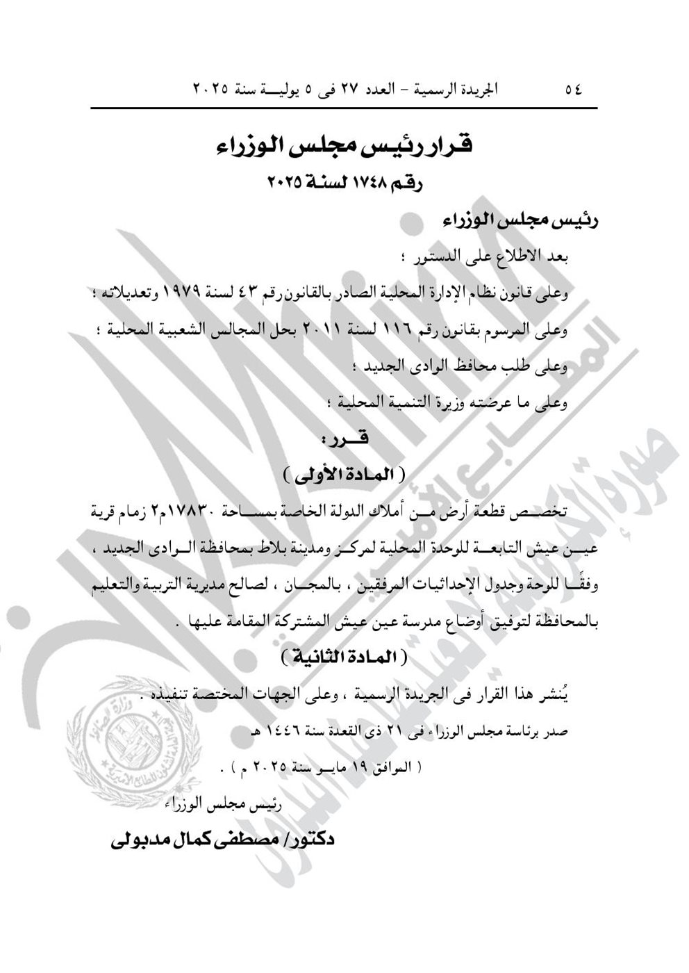 -وقرار رئيس الوزارء رقم 1748 لسنة 2025، بتخصيص قطعة أرض من أملاك الدولة الخاصة زمام قرية عين عيش التابعة للوحدة المحلية لمركز ومدينة بلاط بمحافظة الوادي الجديد، بالمجان، لصالح مديرية التربية والتعليم بالمحافظة لتوفيق أوضاع مدرسة عين عيش المشتركة.