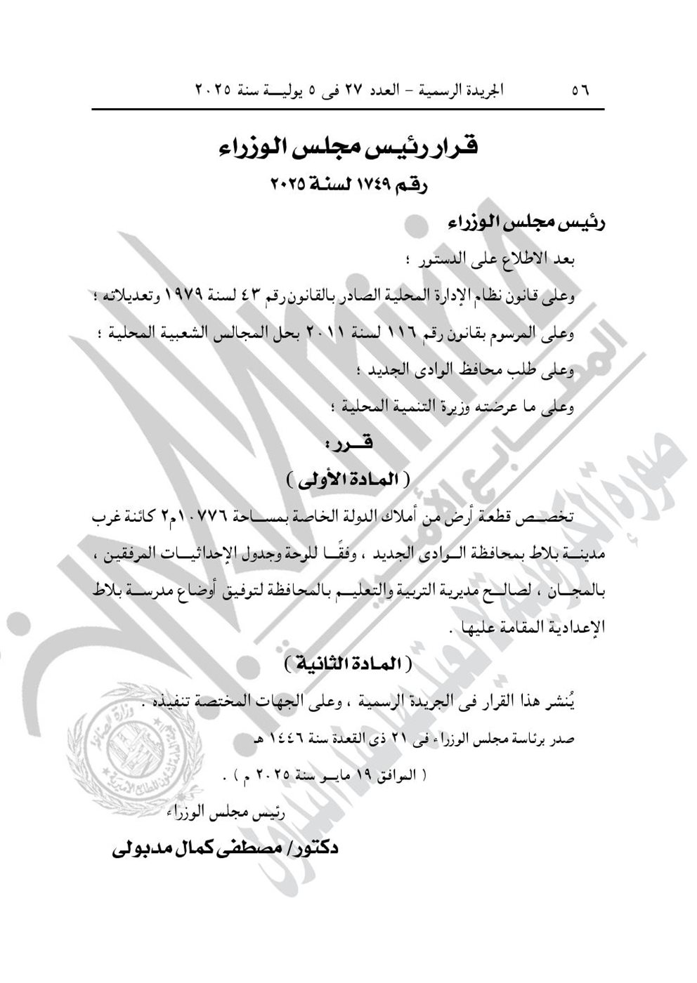 -وقرار رئيس الوزارء رقم 1749 لسنة 2025، بتخصيص قطة أرض من أملاك الدولة الخاصة غرب مدينة بلاط بمحافظة الوادي الجديد، بالمجان، لصالح مديرية التربية والتعليم بالمحافظة، لتوفيق أوضاع مدرسة بلاط الإعدادية.