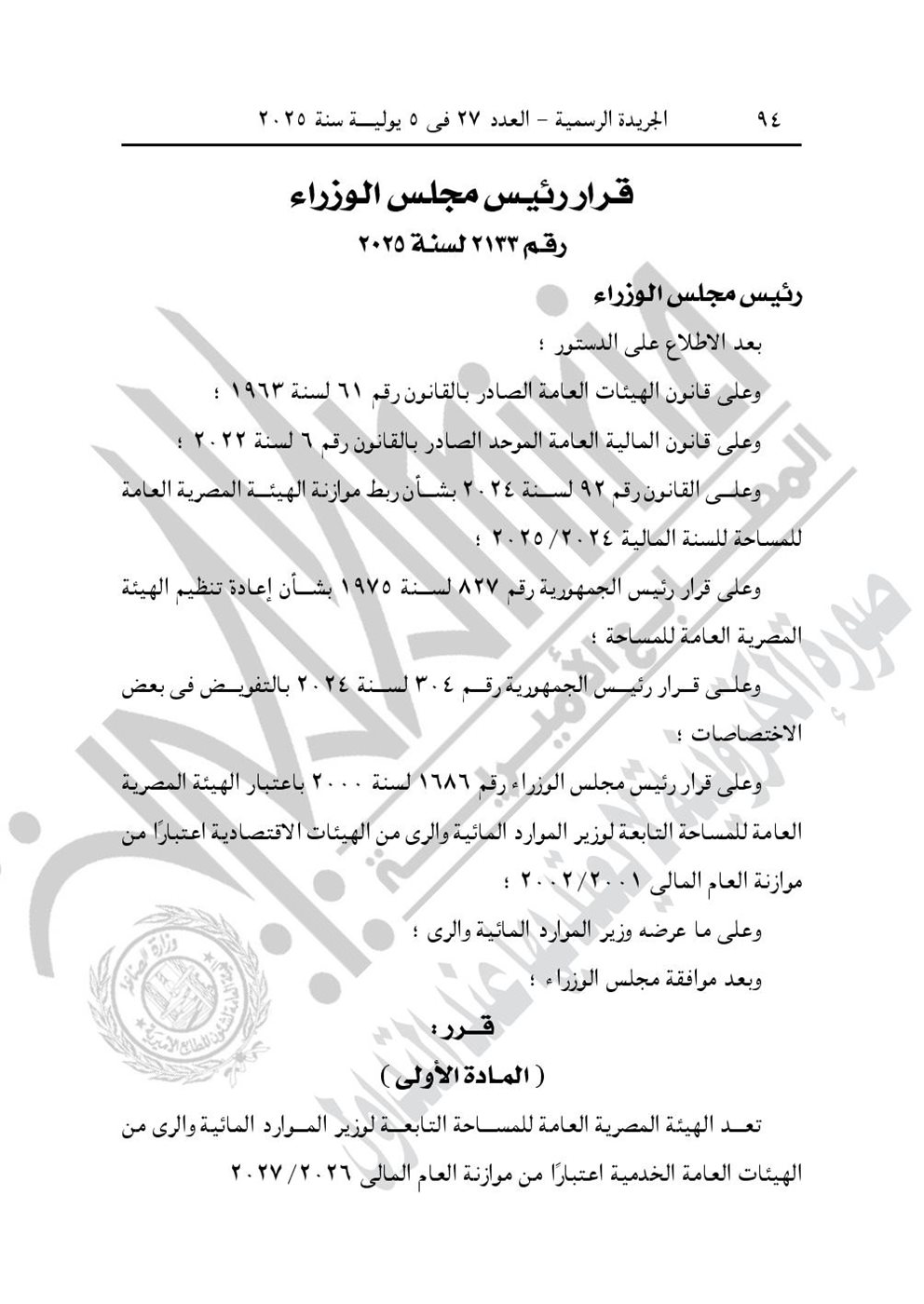 -وقرار رئيس الوزراء رقم 2133 لسنة 2025، وتعد الهيئة المصرية العامة للمساحة التابعة لوزير الموارد المائية والري من الهيئة العامة الخدمية اعتبارًا من موازنة العام المالي 2026-2027.