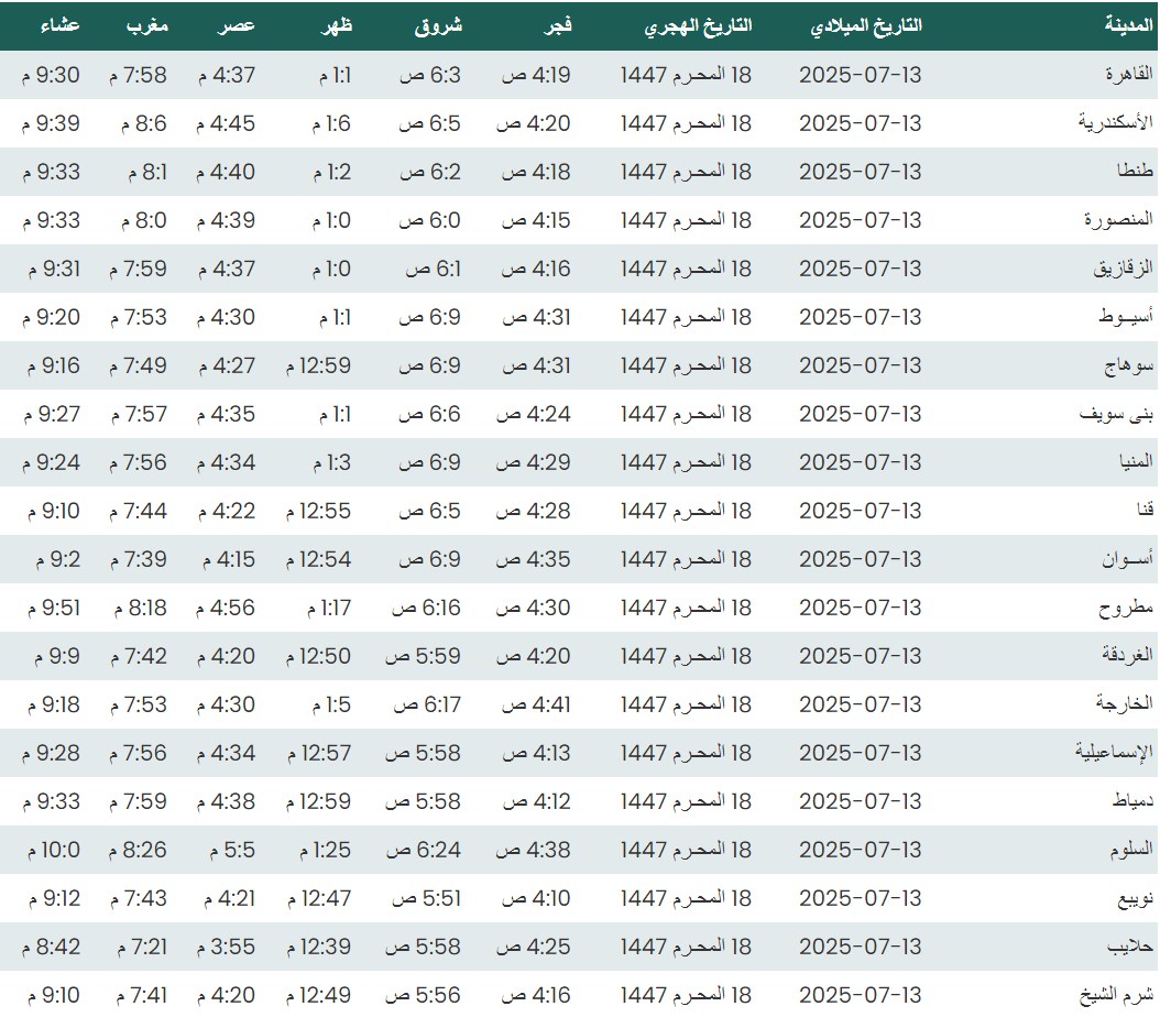 مواقيت الصلاة اليوم الأحد 13 – 7 - 2025 في القاهرة والمحافظات