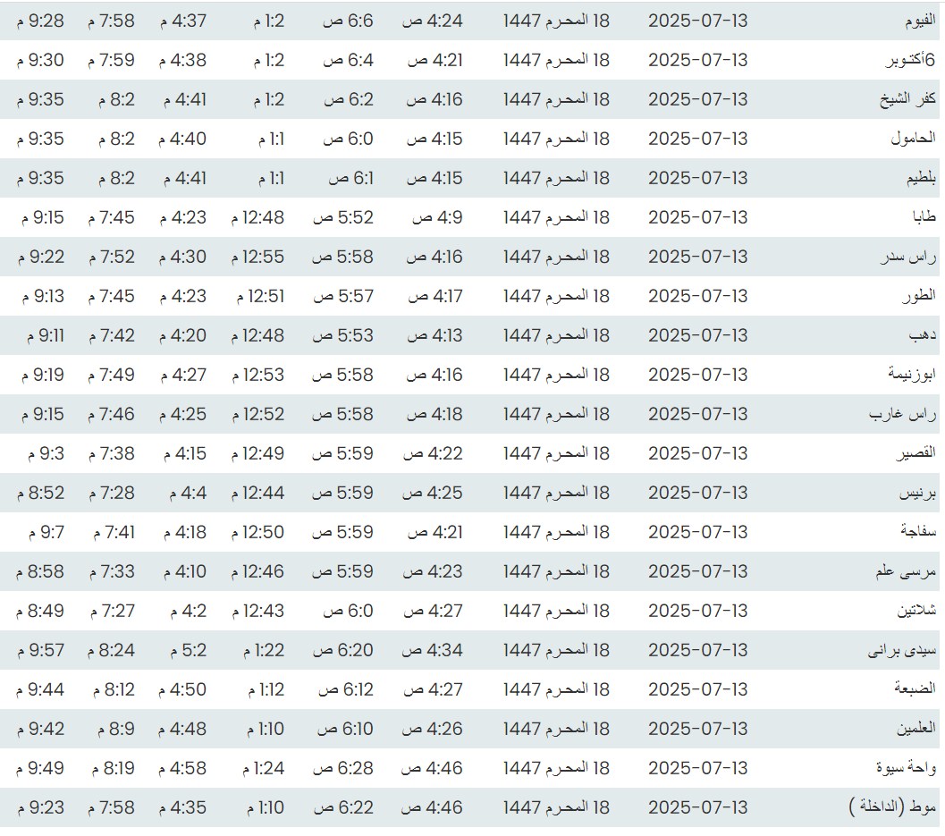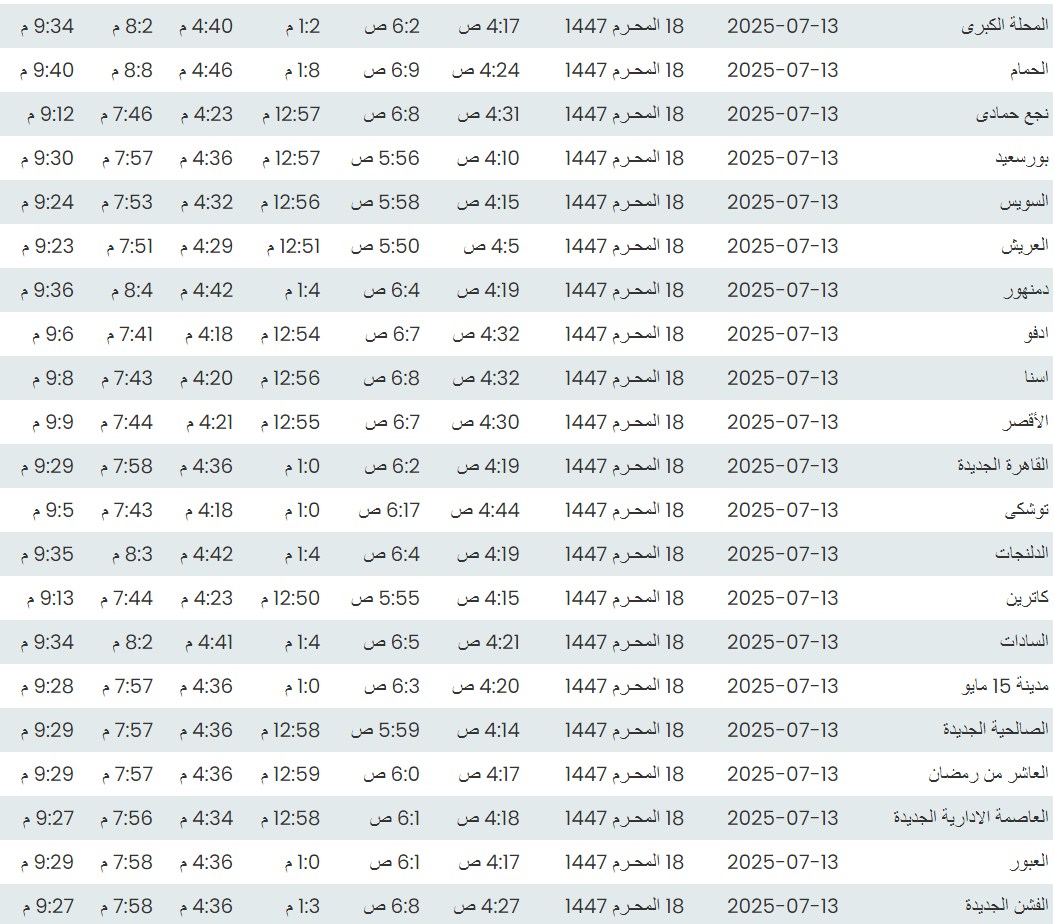 مواقيت الصلاة اليوم وفقًا للتوقيت المحلي لمدينتي القاهرة والإسكندرية وكذلك لعدد من مدن ومحافظات الجمهورية من واقع بيانات الهيئة العامة للمساحة: