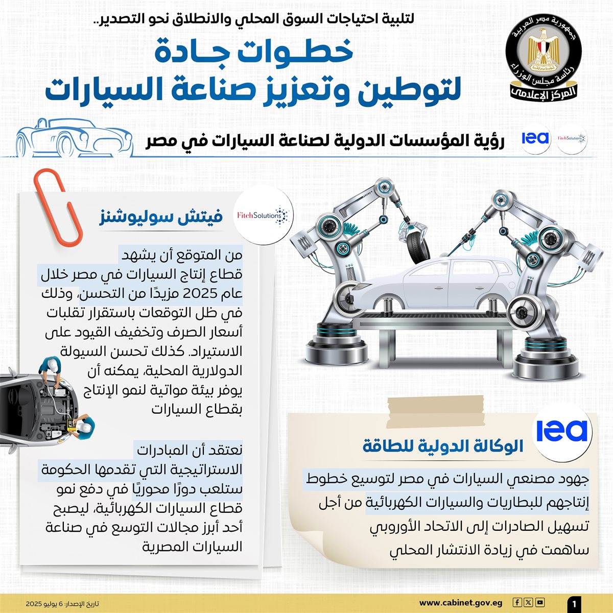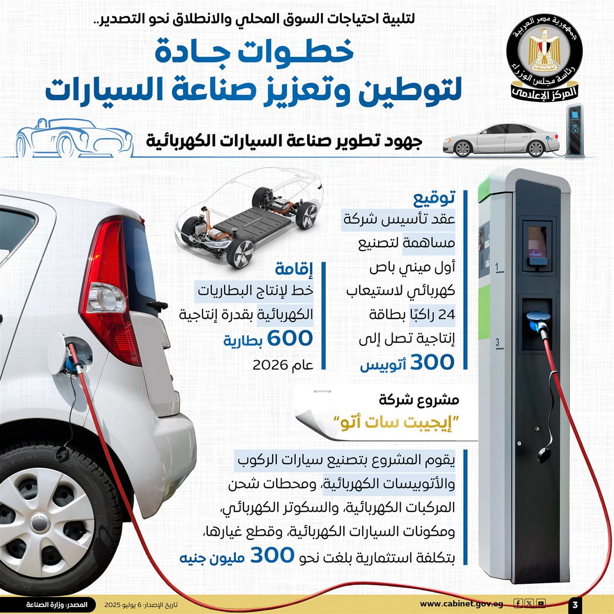 نشر المركز الإعلامي لـمجلس الوزراء، عددًا من الإنفوجرافات عبر منصاته الرسمية على مواقع التواصل الاجتماعي، تسلط الضوء على الخطوات الجادة التي تتخذها الدولة لتوطين وتعزيز صناعة السيارات، بما يلبي احتياجات السوق المحلي، ويعزز القدرة التصديرية، انطلاقًا من إيمان الدولة بأن الصناعة الوطنية تمثل قاطرة التنمية المستدامة.