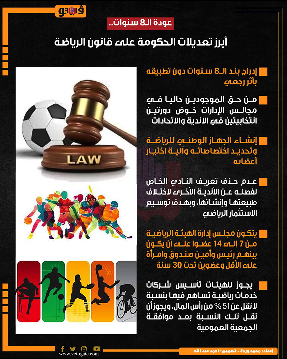 عودة الـ8 سنوات.. أبرز تعديلات الحكومة على قانون الرياضة (إنفوجراف)