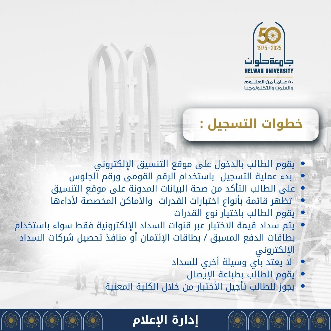 جامعة حلوان تعلن مواعيد فتح باب التقديم لاختبارات القدرات للعام الجامعي 2025/2026 وطرق التقديم