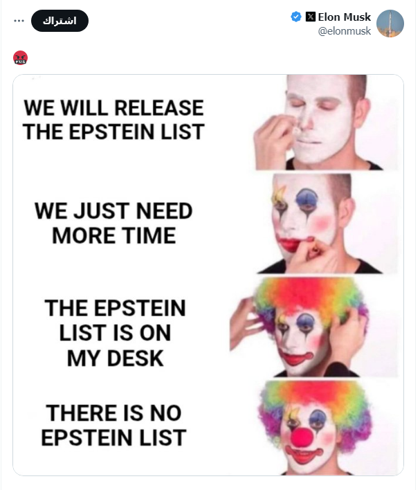 فور نشر وزارة العدل لفيديو وبيان عن وفاة جيفري إبستين، علق أيلون ماسك بنشر تعليق ساخر على موضوع البيان والفيديو، حيث وضع صورة تعبيرية لمهرج يقول: "ليست هناك قائمة لجيفري إبستين"