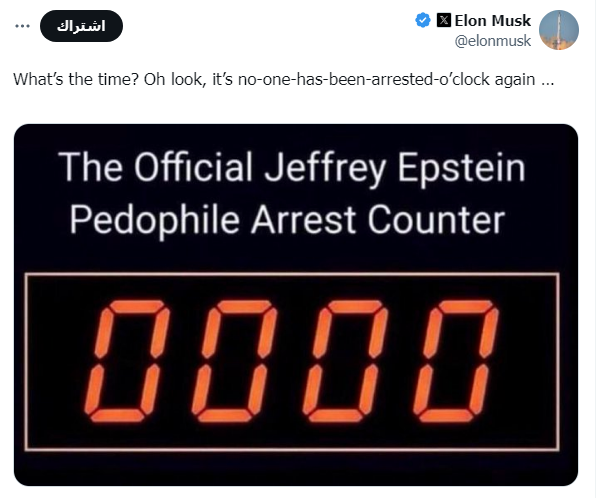 ويقصد السخرية من عدم محاسبة أي شخص متورط في القضايا المرتبطة بجيفري إبستين، رغم مرور الوقت، ورغم حجم الفضائح والأدلة التي تم الكشف عنها من قبل المحكمة الأمريكية.