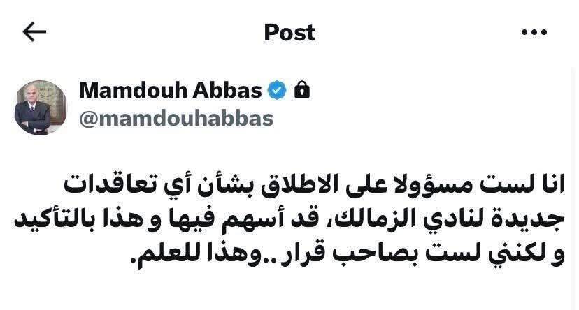 وكتب عباس: “أنا لست مسئولًا على الإطلاق بشأن أي تعاقدات جديدة لنادي الزمالك، قد أُسهم فيها وهذا بالتأكيد، ولكنني لست بصاحب قرار… وهذا للعلم.”