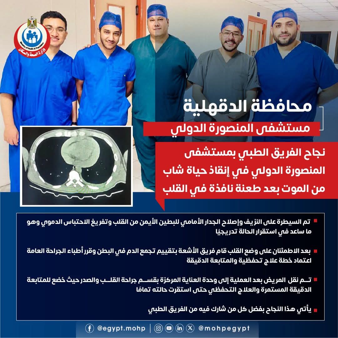 أعلنت وزارة الصحة عن نجاح الفريق الطبي بمستشفى المنصورة الدولي في إنقاذ حياة شاب من الموت بعد طعنة نافذة في القلب.