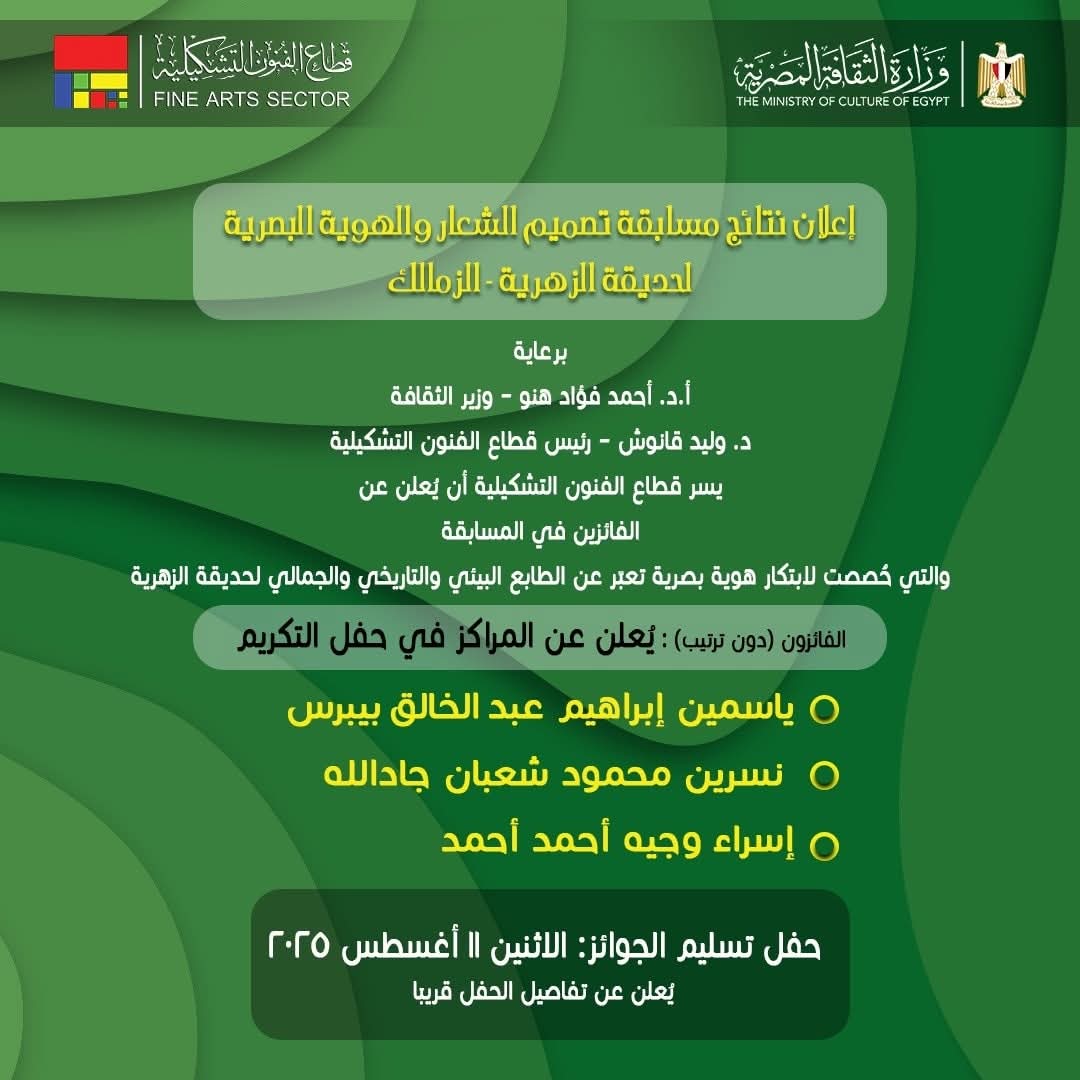 أعلن قطاع الفنون التشكيلية بوزارة الثقافة، اليوم، عن النتائج النهائية لمسابقة تصميم الشعار والهوية البصرية لحديقة الزهرية بالزمالك، وذلك تحت رعاية الدكتور أحمد فؤاد هنو، وزير الثقافة، وبرئاسة الدكتور وليد قانوش، رئيس قطاع الفنون التشكيلية.