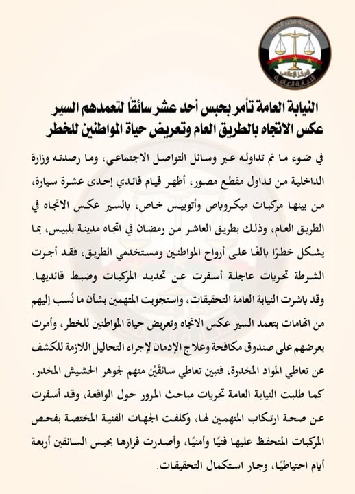 رصدت وزارة الداخلية تداول مقطع مصور عبر وسائل التواصل الاجتماعي، أظهر قيام قائدي إحدى عشرة سيارة، من بينها مركبات ميكروباص وأتوبيس خاص، بالسير عكس الاتجاه في الطريق العام، وذلك بطريق العاشر من رمضان في اتجاه مدينة بلبيس، بما يشكل خطرًا بالغًا على أرواح المواطنين ومستخدمي الطريق، وأجرى رجال الشرطة تحريات عاجلة أسفرت عن تحديد المركبات وضبط قائديها.
