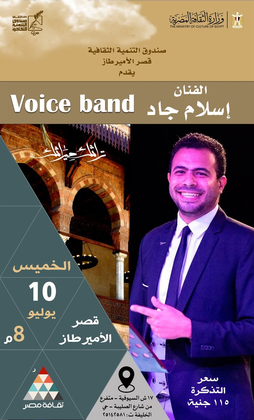 يقيم قطاع صندوق التنمية الثقافية برئاسة المعماري حمدى السطوحى، حفلًا غنائيًا جديدًا لفرقة "فويس باند" وذلك بمركز ابداع قصر الأمير طاز بشارع السيوفية بالخليفة، بقيادة المايسترو إسلام جاد، يوم الخميس القادم (10 يوليو) في تمام الساعة الثامنة مساءً.