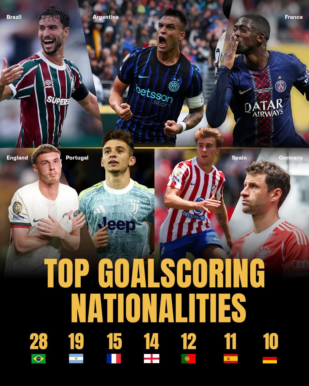وسجل لاعبو البرازيل 28 هدفا في الصدارة، ثم لاعبو الأرجنتين 19 هدفا، ثم فرنسا 15 هدفا، وإنجلترا 14 هدفا، والبرتغال 12 هدفا، ثم إسبانيا 11 هدفا، وألمانيا 10.