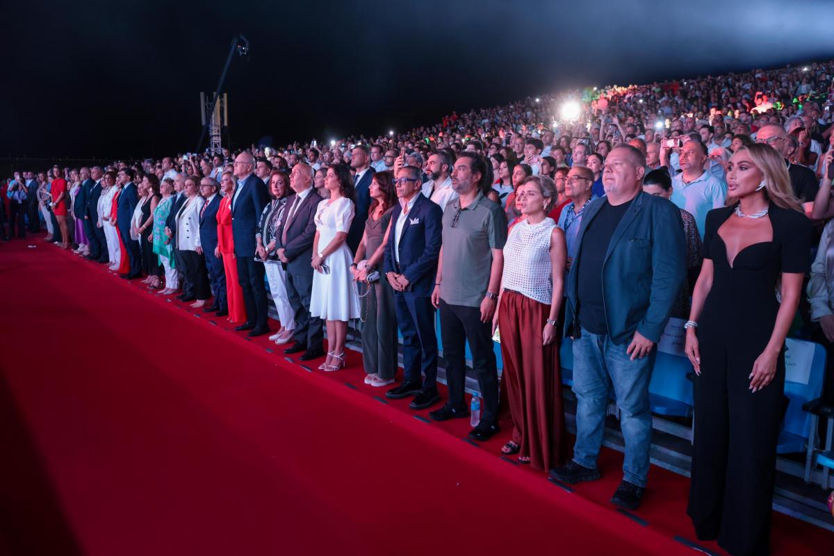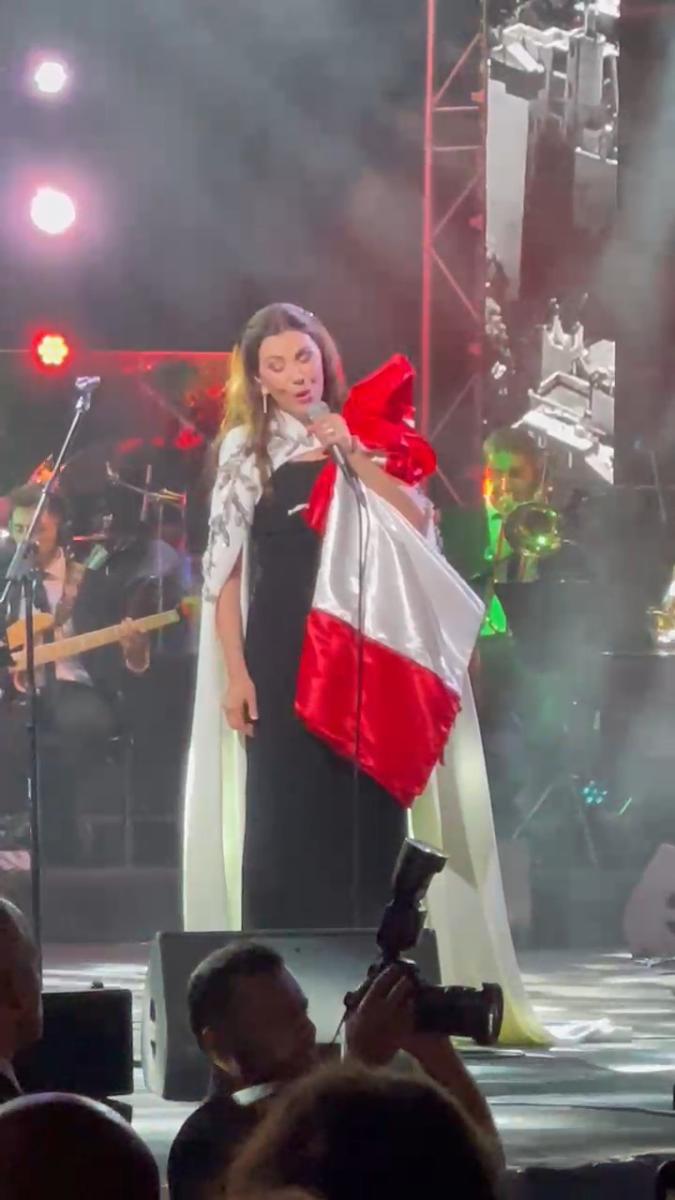 وانحنت ماجدة الرومي باحترام أمام العلم اللبناني الذي سلّم إليها لدقائق بعد تأديتها أغنية "ست الدنيا"، وسط تصفيق حارّ من الحضور، واستقبالها باقة من الورود قدّمها لها أطفال الحضور في مشهد عاطفي يعكس ارتباطها العميق بوطنها.