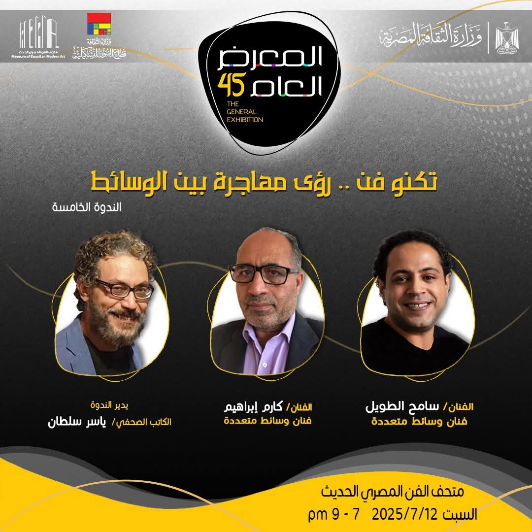 في إطار الفعاليات الثقافية المصاحبة للمعرض العام في دورته الخامسة والأربعين، يستضيف متحف الفن المصري الحديث بساحة دار الأوبرا المصرية، يوم السبت الموافق 12 يوليو 2025، ندوة فنية بعنوان "تكنو فن.. رؤى مهاجرة بين الوسائط"، وتهدف الندوة إلى فتح آفاق جديدة للتفكير في التحولات التي يشهدها الوسيط الفني، وإعادة طرح التساؤلات حول الحدود المتداخلة بين التقنيات، واللغة، والرؤية الفنية المعاصرة.