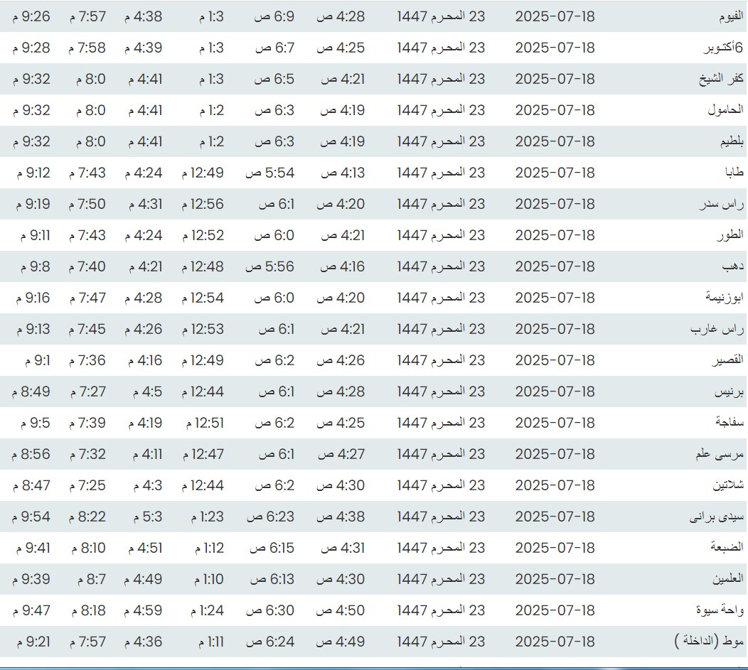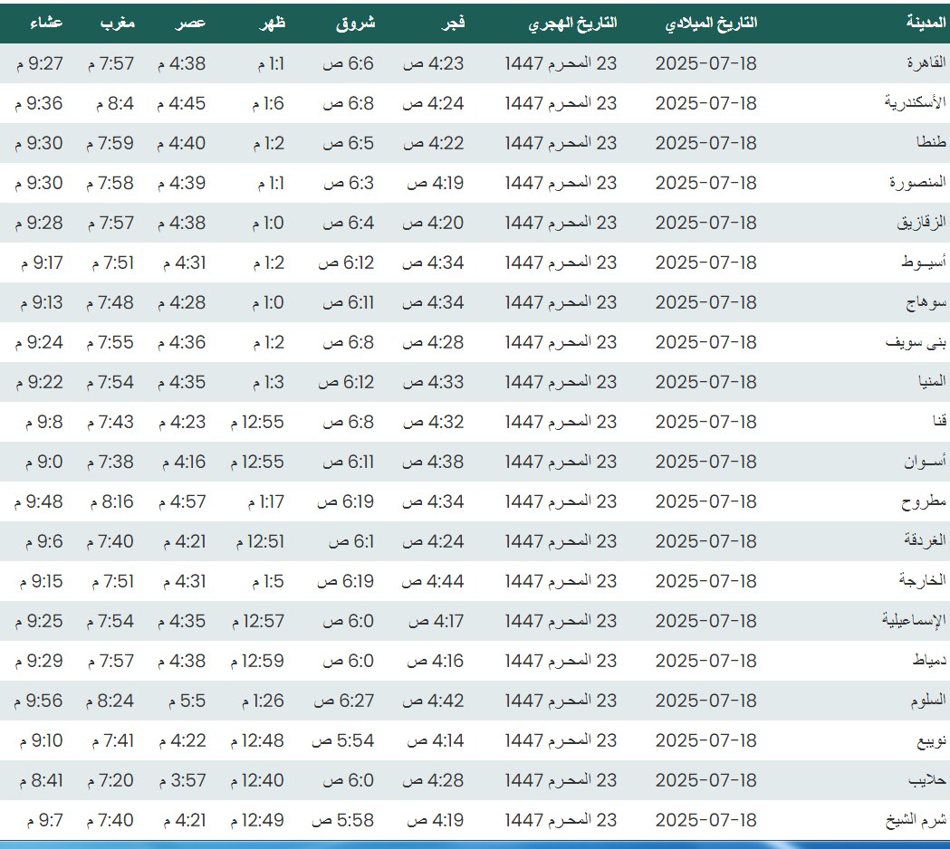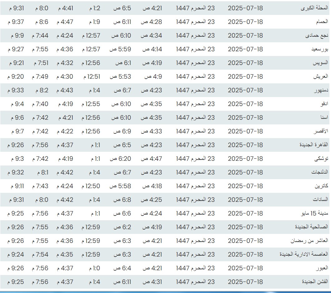 مواقيت الصلاة اليوم وفقًا للتوقيت المحلي لمدينتي القاهرة والإسكندرية وكذلك لعدد من مدن ومحافظات الجمهورية من واقع بيانات الهيئة العامة للمساحة: