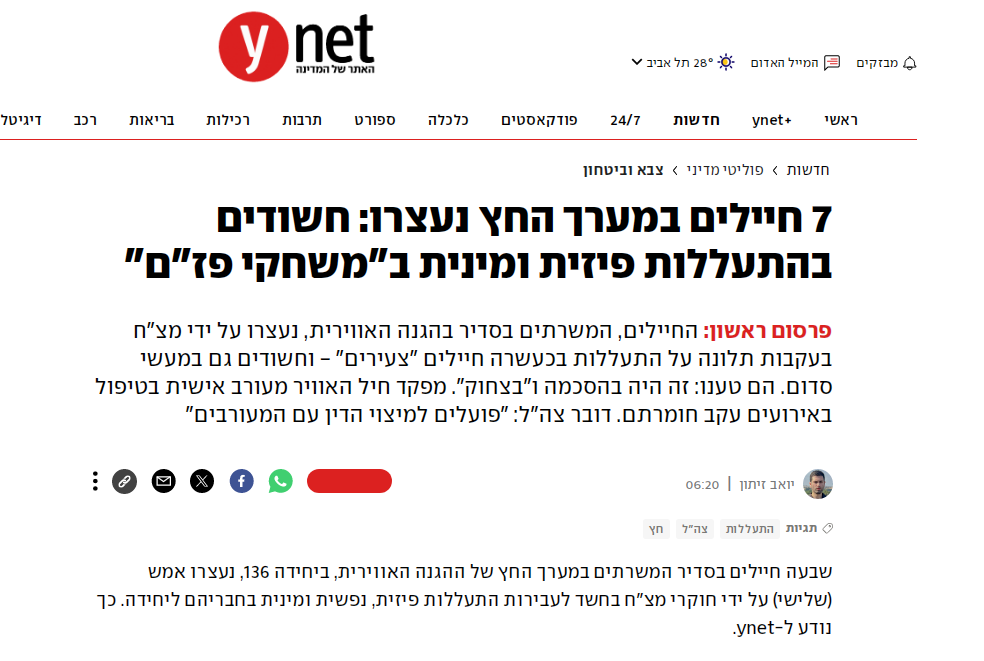وأشارت الصحيفة العبرية إلى أن الجنود الذين اعتقلتهم الشرطة العسكرية في جيش الاحتلال الإسرائيلي، والذين يبلغ عددهم نحو 7 جنود يخدمون بانتظام في قوات الدفاع الجوي، وتم اعتقال الجنود المتهمين إثر شكوى تتعلق بإساءة معاملة نحو عشرة جنود شباب، والاعتداء الجنسي عليهم.