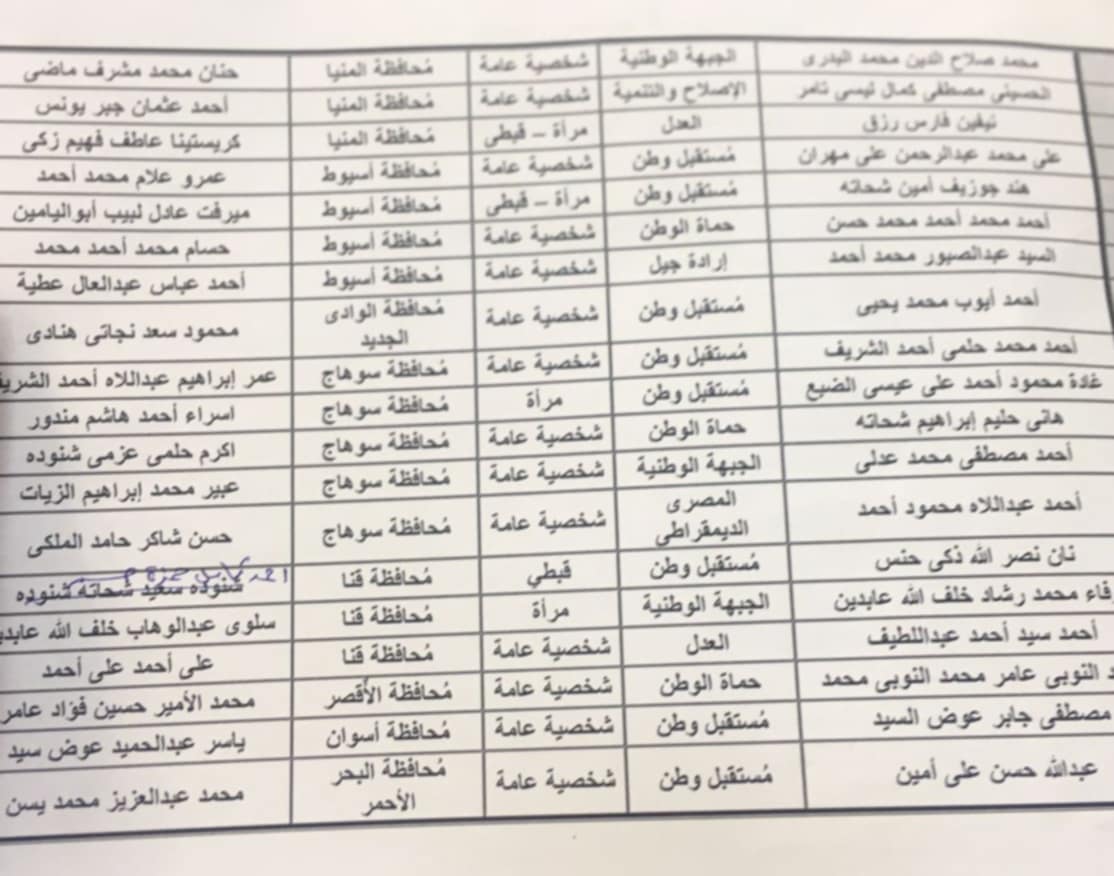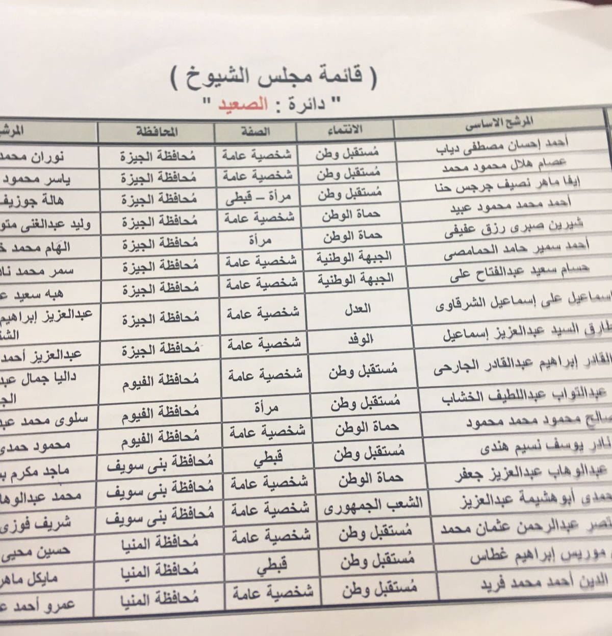 أسماء مرشحي القائمة الوطنية من أجل مصر لانتخابات الشيوخ بقطاع الصعيد
