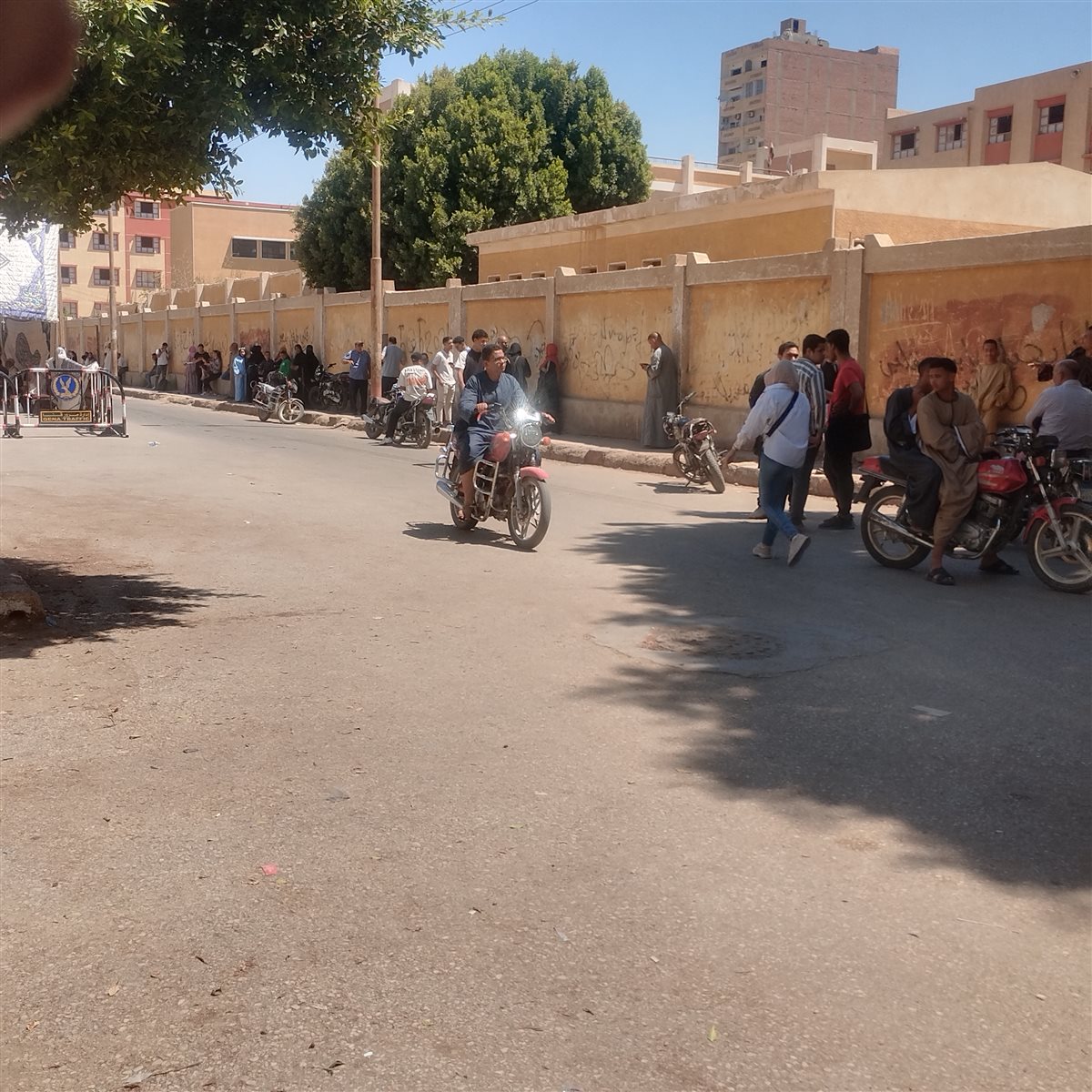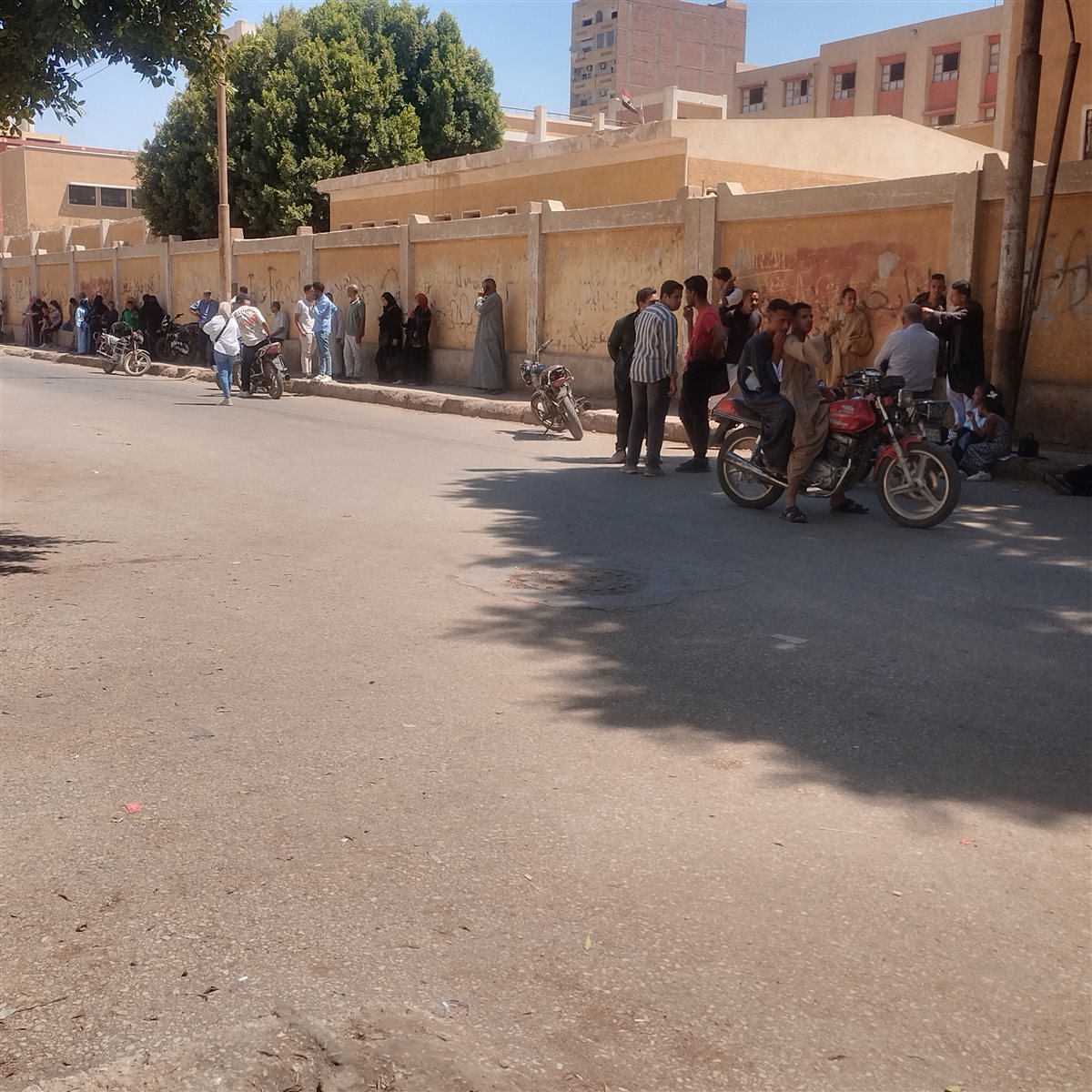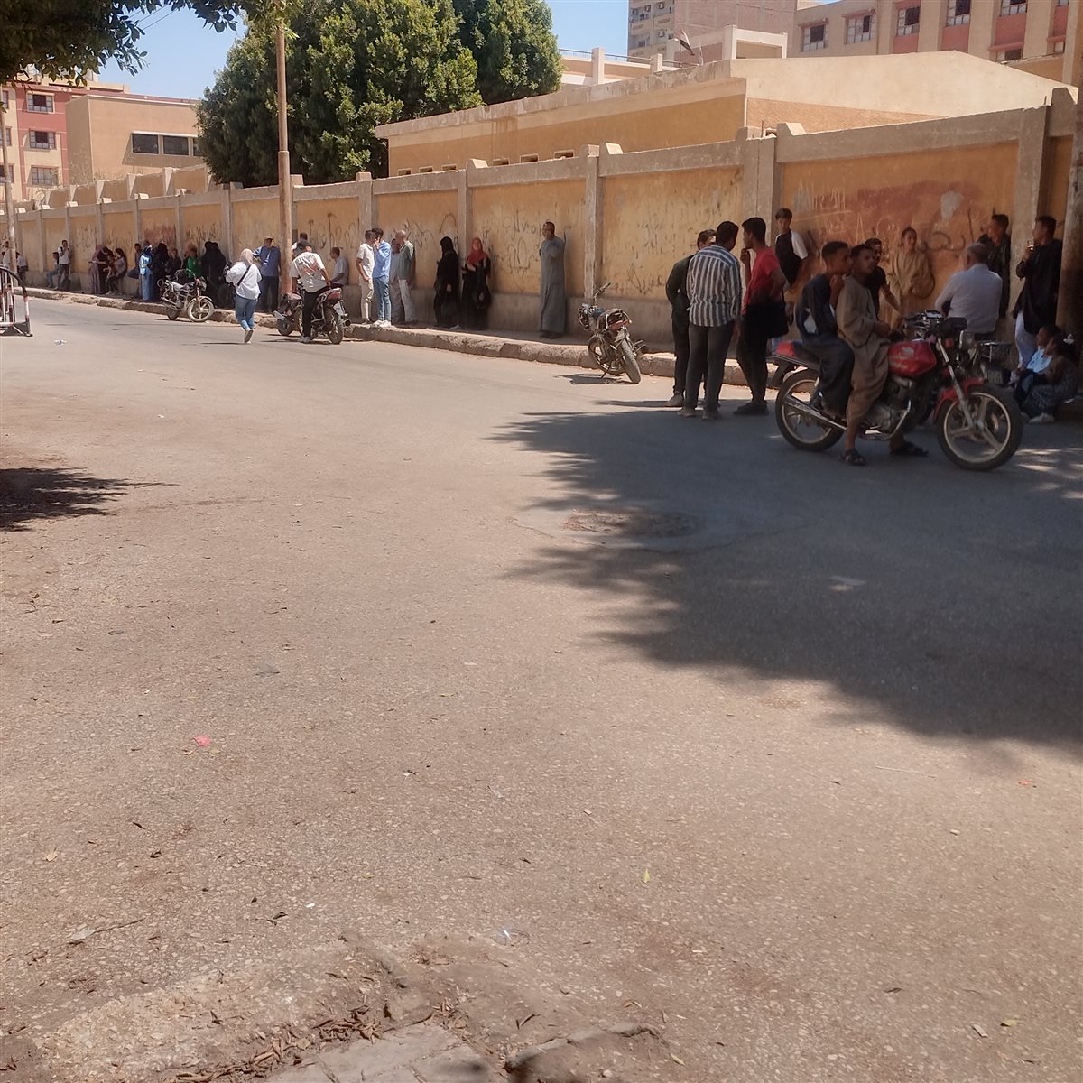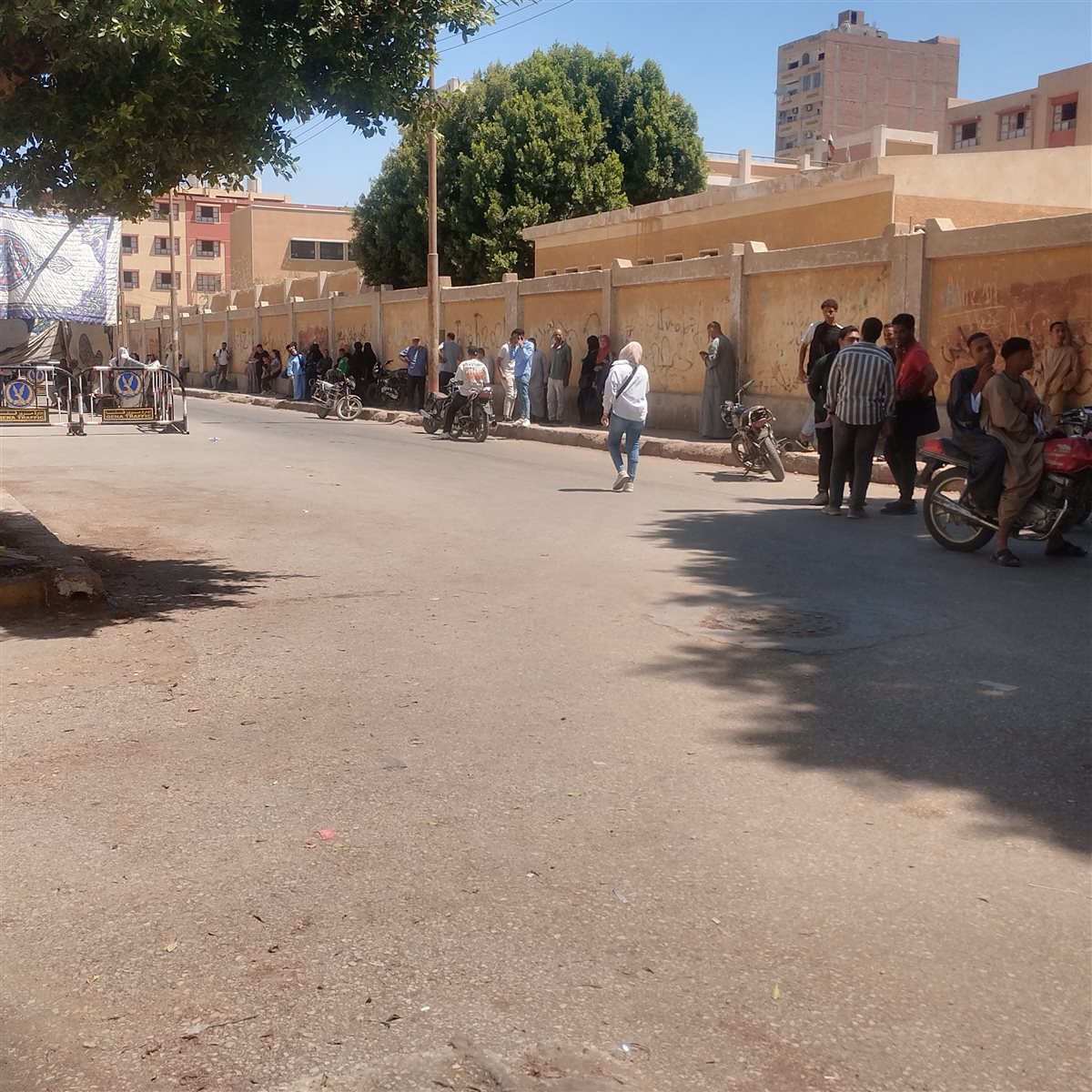 وقف عدد من أولياء أمور طلاب الثانوية العامة على الرصيف أمام لجان الامتحانات في محافظة قنا، ينتظرون أبناءهم أمام اللجان بمدينة نجع حمادي شمال محافظة قنا، وذلك رغم ارتفاع درجة الحرارة.