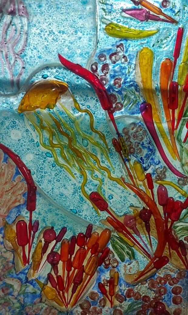 ويضم المعرض 15 عمل فنى من الزجاج الجدارى والمصهور ووحدات من الزجاج البيركس المشكل بطريقة النفخ بطرق مختلفة منها الصب بالقوالب والتشكيل بالنفخ لتبرز العلاقة بين النفخ والصب توظيفهما فى اعمال جدارية من خامة الزجاج.