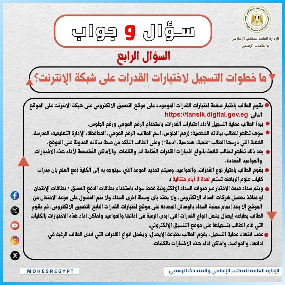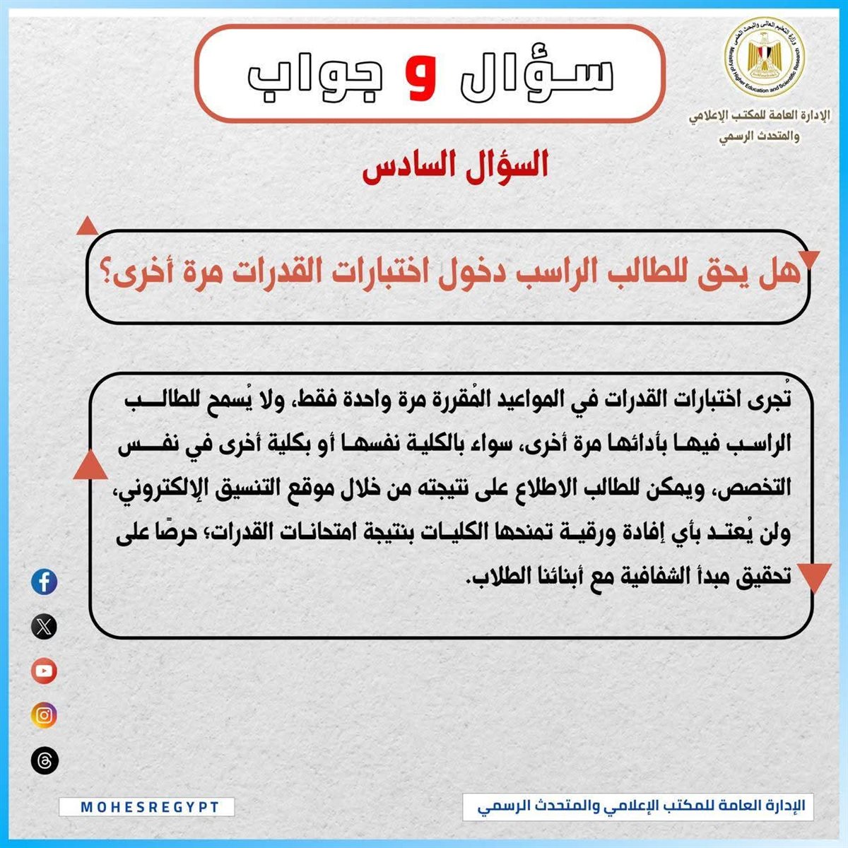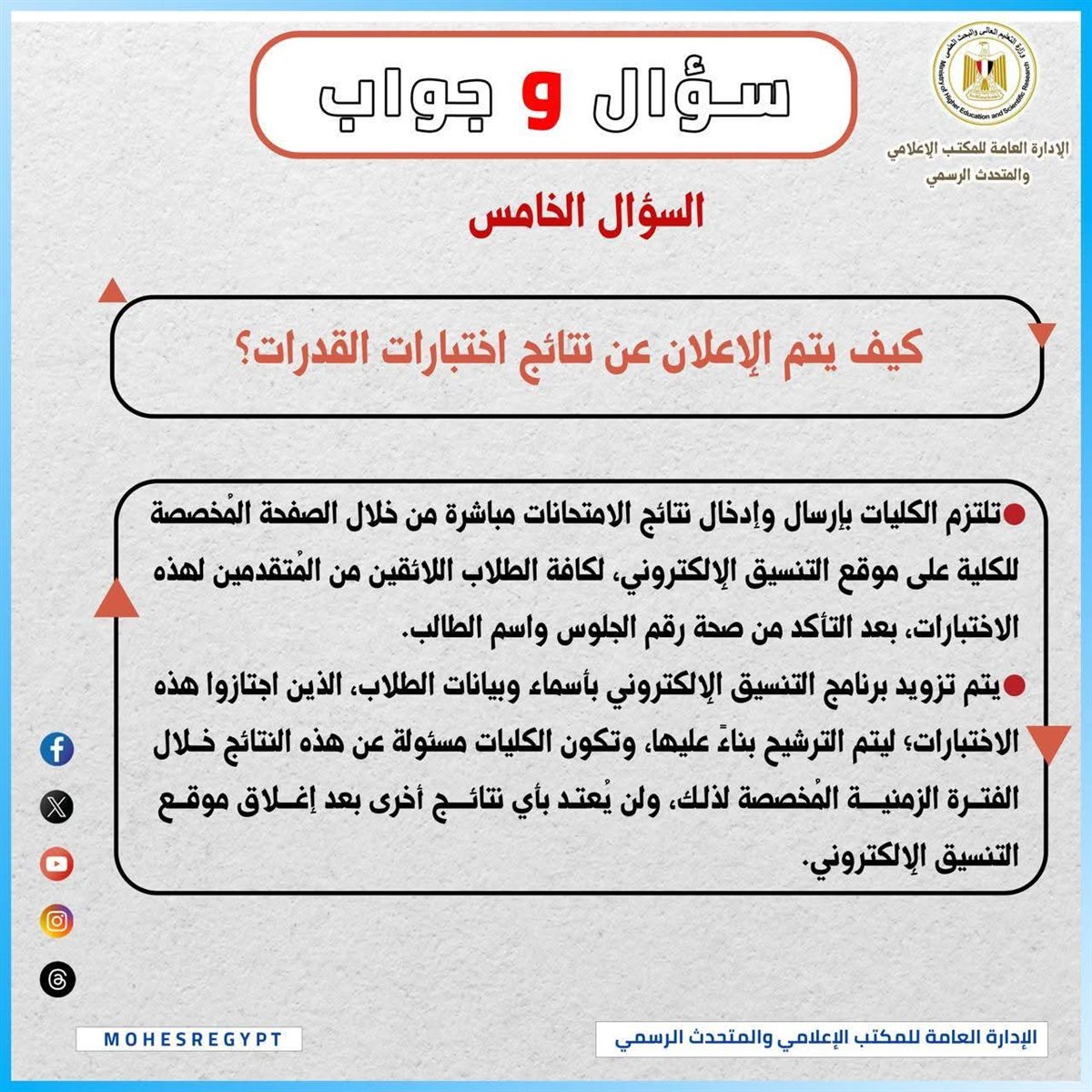 - غير مسموح لأولياء الأمور بدخول الكليات، ومسموح فقط بدخول الطلاب في اليوم الذي حدده موقع التنسيق لإجراء الاختبار.