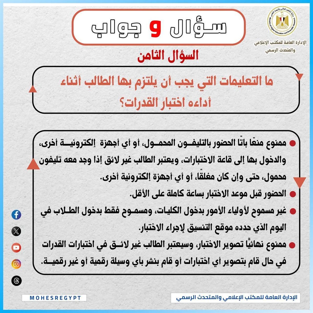 - ممنوع نهائيًّا تصوير الاختبار، وسيعتبر الطالب غير لائق في اختبارات القدرات في حال قام بتصوير أي اختبارات أو قام بنشره بأي وسيلة رقمية أو غير رقمية.