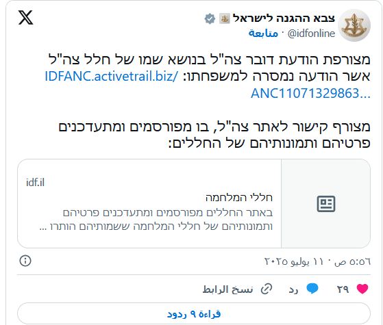 وأشار إلى أن الضابط القتيل، من مستوطنة "شورشيم"، يشغل منصب قائد وحدة استطلاع في لواء "جولاني"، وسقط في معركة بمدينة خان يونس.