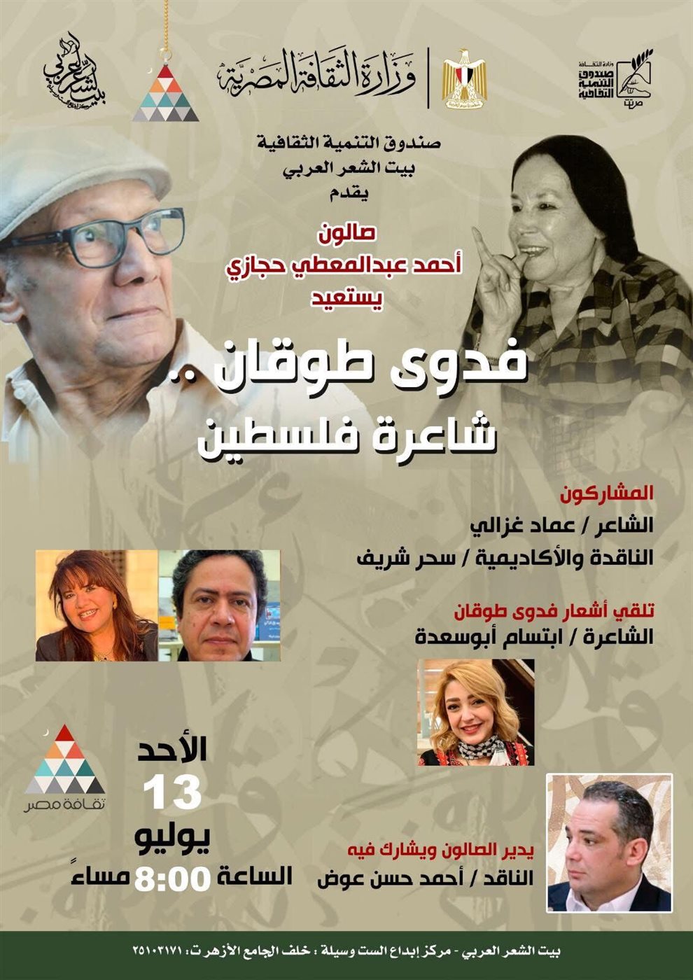 ينظم قطاع صندوق التنمية الثقافية، من خلال بيت الشعر العربي "بيت الست وسيلة" أمسية جديدة من أمسيات صالون الشاعر الكبير أحمد عبد المعطي حجازي، والذي يستعيد هذا الشهر الشاعرة فدوى طوقان شاعرة فلسطين وذلك في الثامنة من مساء الأحد القادم الموافق 13 يوليو.