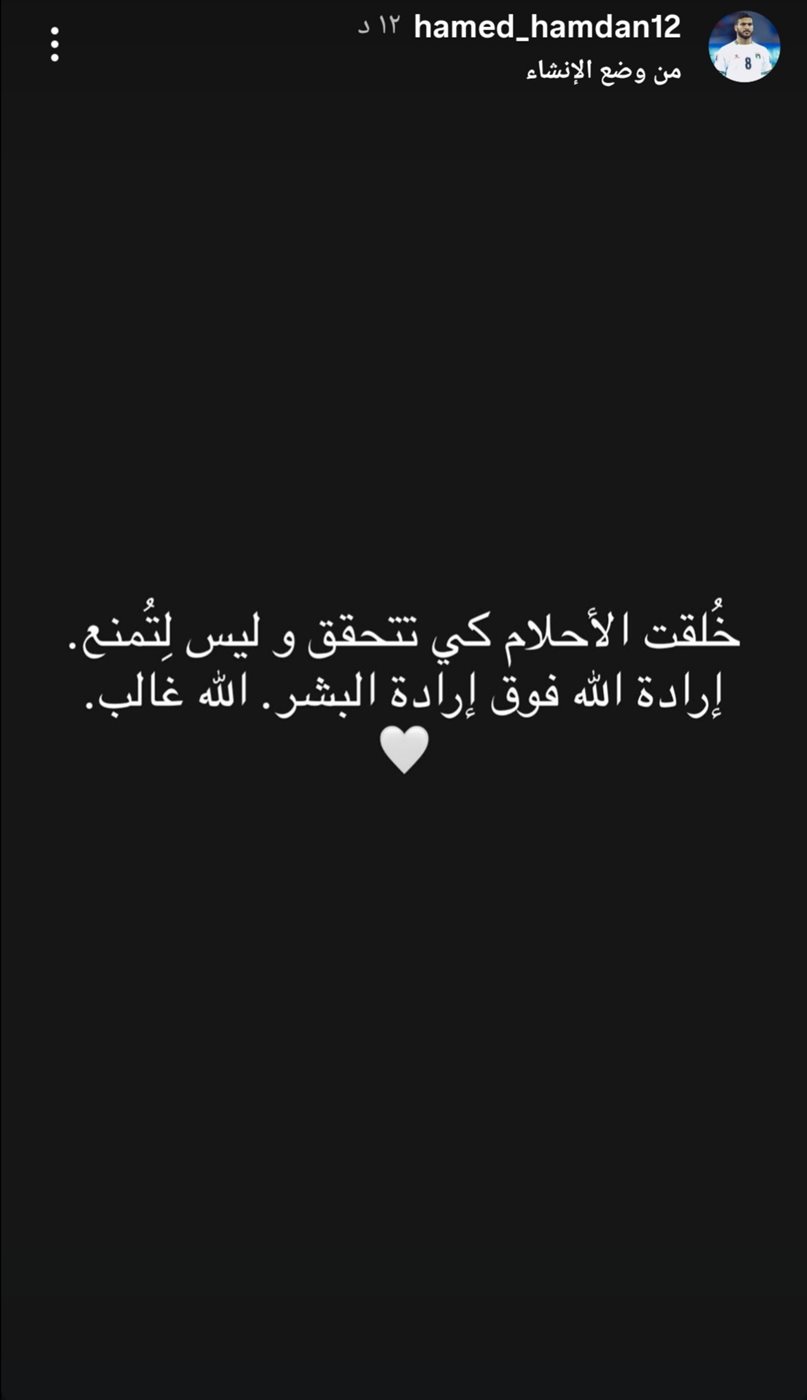 وكتب حامد حمدان رسالة مصحوبة بقلب "أبيض" عبر ستوري انستجرام: “خلقت الأحلام كي تتحقق وليس لتمنع، إرادة الله فوق إرادة البشر، الله غالب”.