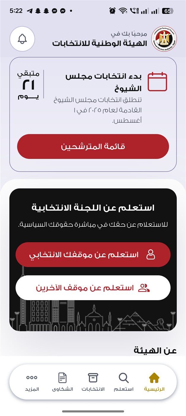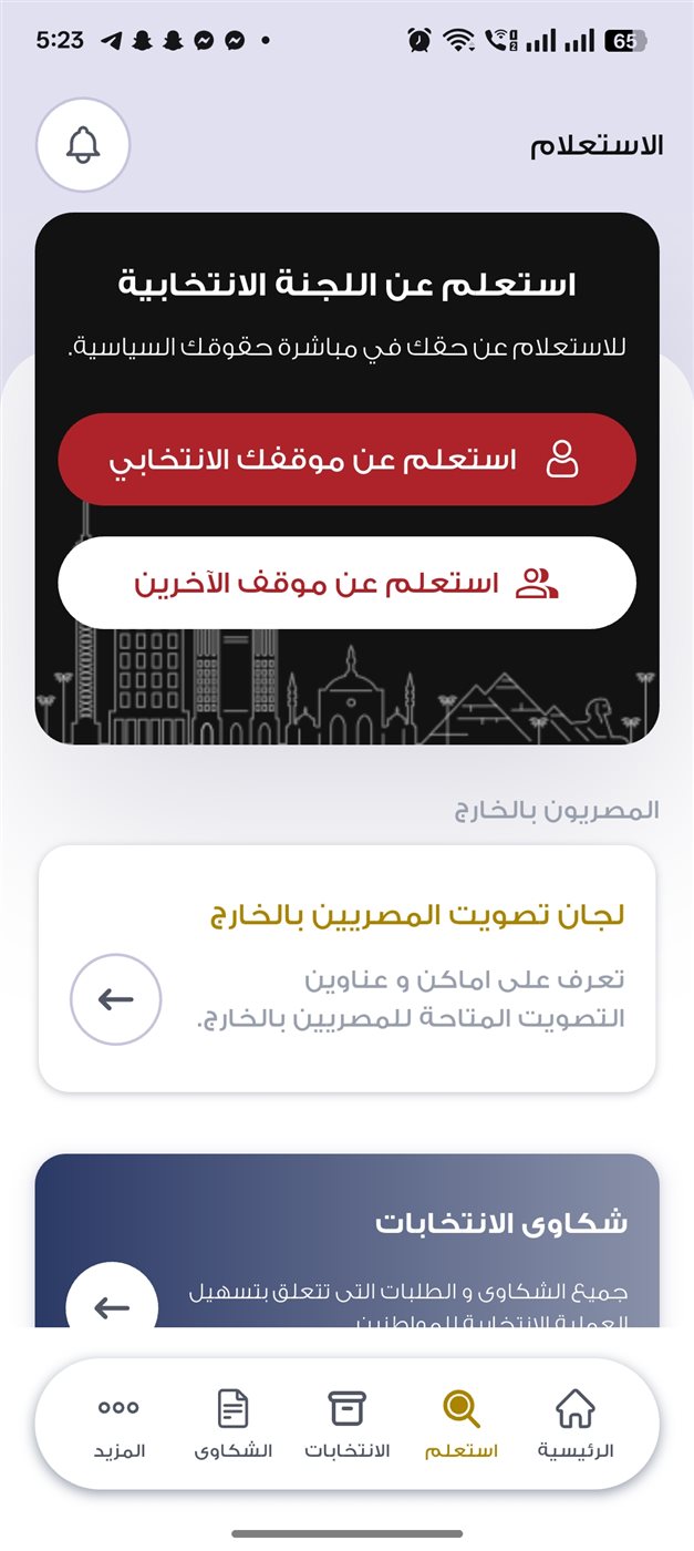 كما يوفر التطبيق خدمة الاستعلام عن موقفك الانتخابي، للتأكد من أحقيتك في التصويت أو وجود أي مانع قانوني يمنعك من ممارسة حقك الانتخابي، بالإضافة إلى إمكانية الاستعلام عن موقف الآخرين