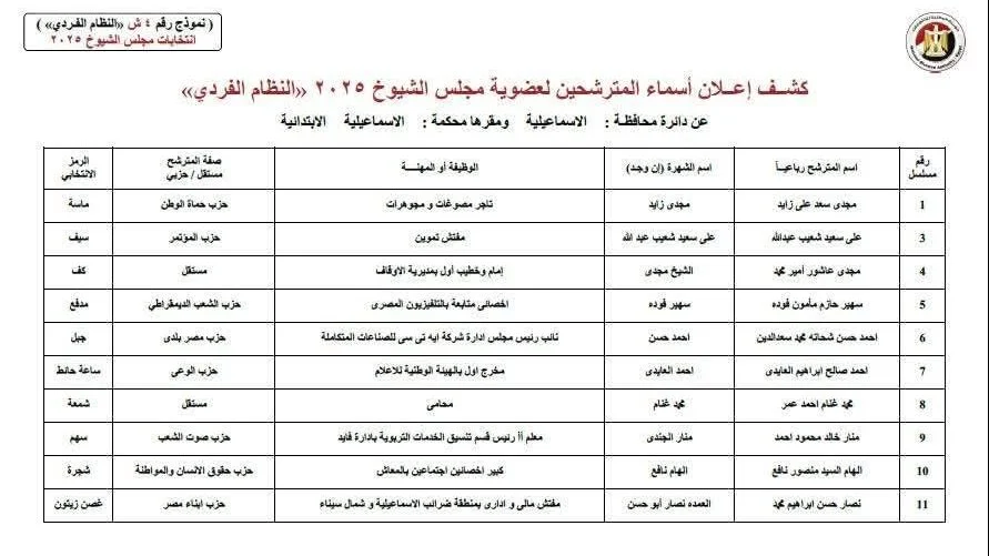 أعلنت الهيئة الوطنية للانتخابات، برئاسة القاضي حازم بدوي، قائمة المرشحين المبدئية لخوض انتخابات مجلس الشيوخ 2025، "النظام الفردي" في محافظة الإسماعيلية.