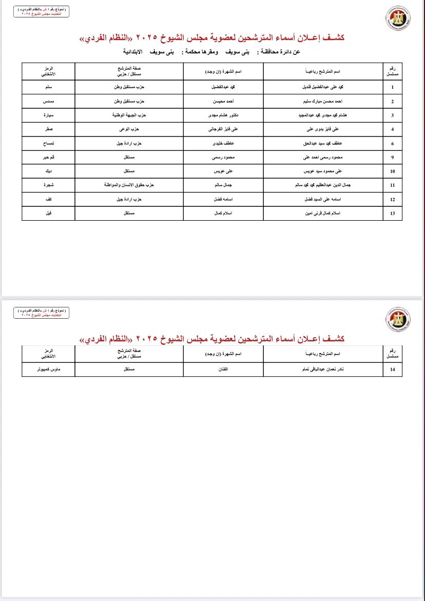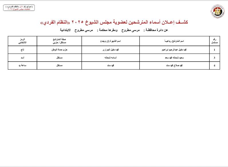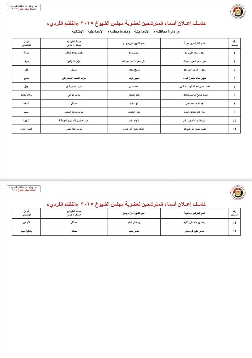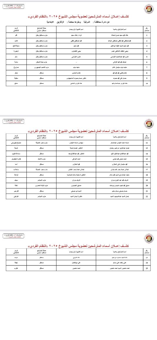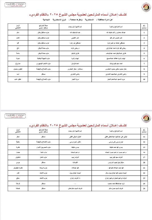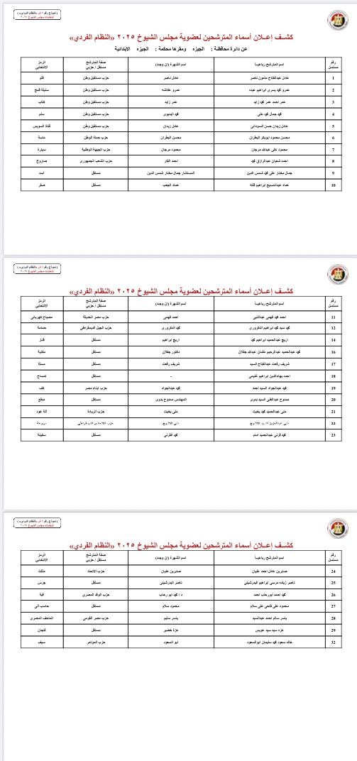 ونشرت الهيئة الوطنية للانتخابات أسماء المرشحين لعضوية مجلس الشيوخ بالنظام الفردي عن دوائر محافظات: الجيزة، مرسى مطروح، البحيرة، الإسكندرية، جنوب سيناء، شمال سيناء، السويس، بورسعيد، دمياط، الشرقية، البحر الأحمر، أسوان، الأقصر، قنا، سوهاج، الوادي الجديد، أسيوط، المنيا، بني سويف، المنيا.